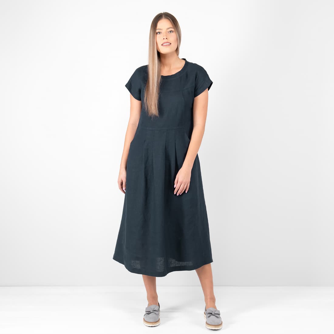 • VERENA lininė tamsiai mėlyna suknelė su klostelėmis priekyje