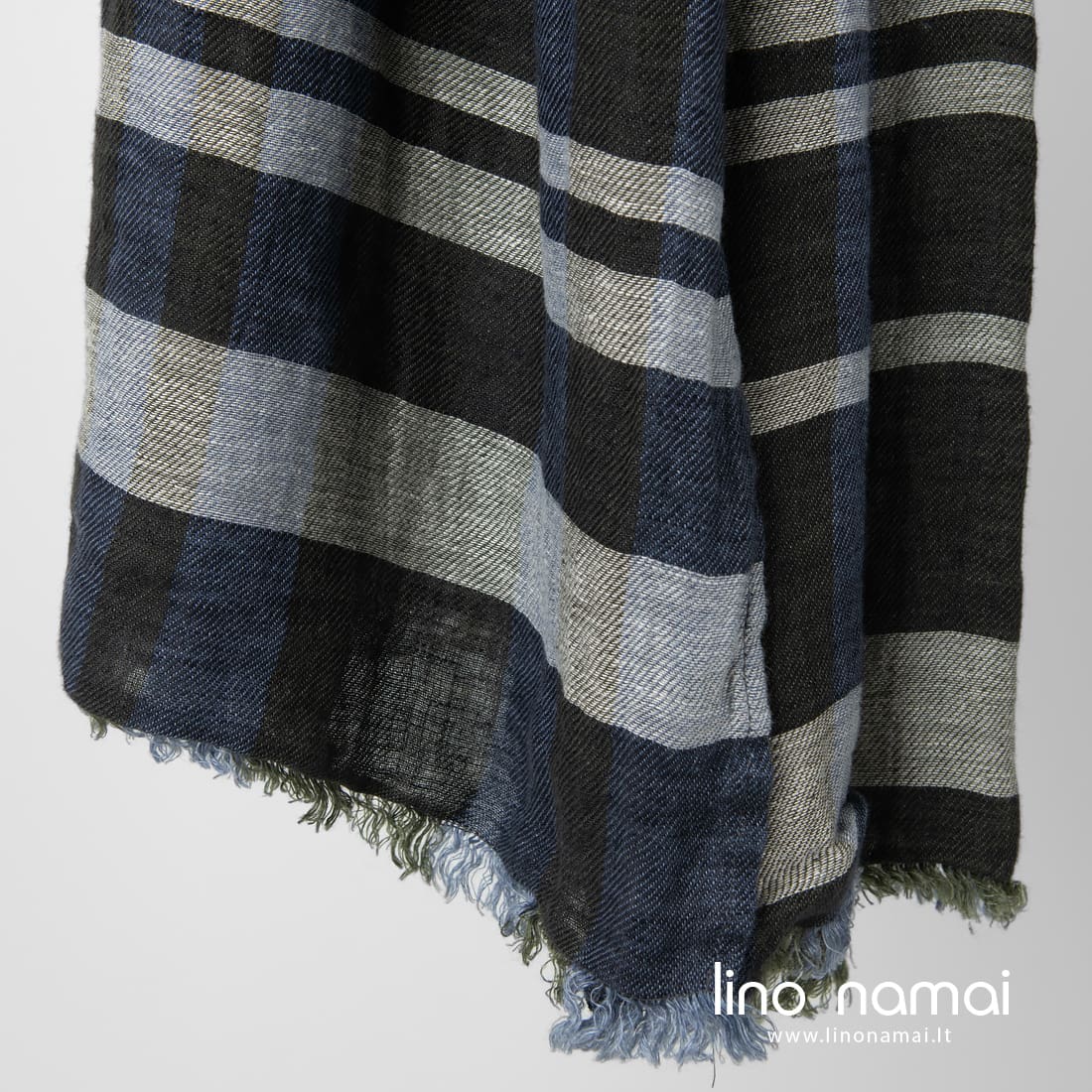 BUGA mėlynas languotas šalikas. Šio gaminio įstrižais ruoželiais austame lino audinyje suderinti mėlynai pilki, rudai žali (samanų spalvos), juodi ir natūralios spalvos (nedažyti, rusvai pilki) verpalai. Speciali skalbimo technologija suminkštino liną, padarė jį švelnų, malonų odai. Šalikas puoštas žaismingais pešiotais 2cm ilgio kutais trumposiose kraštinėse. Lengvas aksesuaras, puikiai derantis prie tamsesnių drabužių.