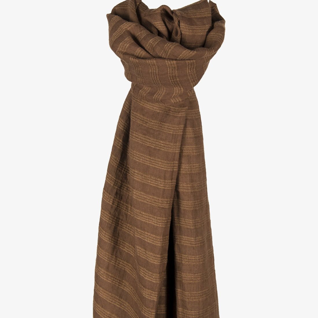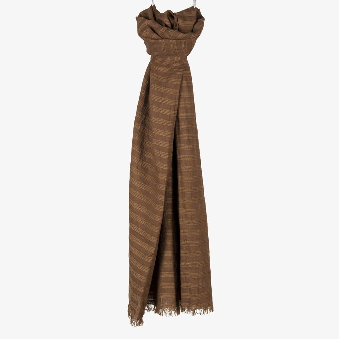 Lininis rudas dryžuotas šalikas: rudame gaminio audinio fone įaudėme šviesesnes horizontalias juosteles. Šį aksesuarą pasiuvome iš specialiu būdu skalbto, todėl ypač minkšto ir švelnaus 100% lino, ir trumposiose kraštinėse papuošėme pešiotais kutais.