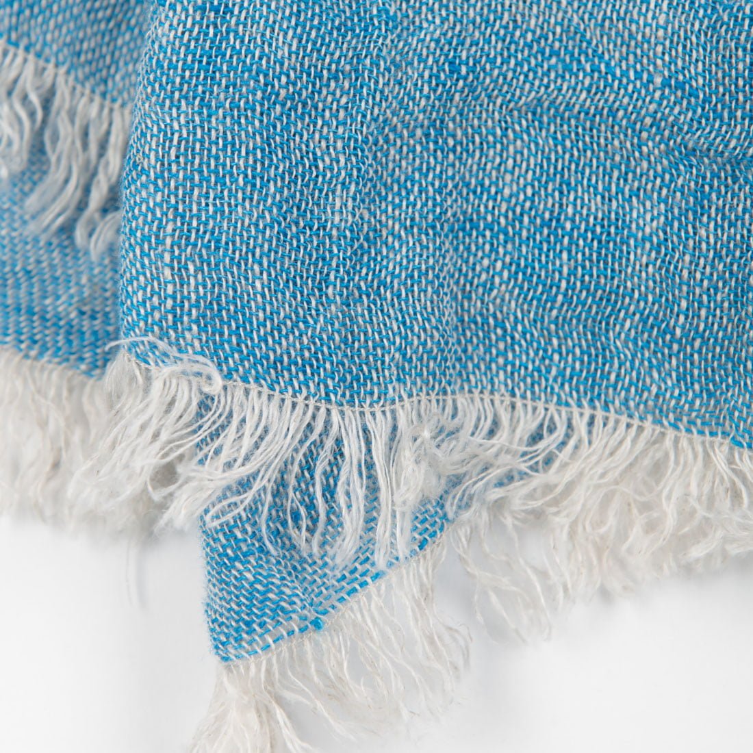 Lininis šalikas melanžinis pilkšvai mėlynas. Gaminio audiniui naudoti natūraliai pilki (nedažyti) verpalai prigesino kitą naudotą, ryškią briliantinę mėlyną, spalvą. Šis nepakartojamas spalvų derinys gali būti gražus Jūsų įvaizdžio akcentas. Trumpąsias kraštines puošia pešioti kutai. Šalikas pasiūtas iš specialiai skalbto lino. Toks audinys labai minkštas, malonus odai.