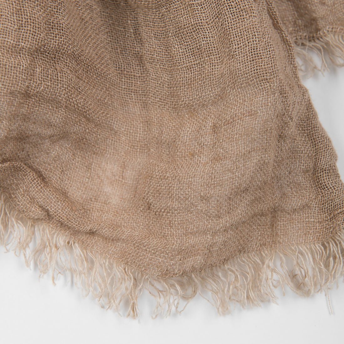 Lininis šalikas šviesiai rudas pasiūtas iš reto lengvo 100% lino audinio, dekoruotas kutais trumposiose kraštinėse. Gaminio audinys minkštas, malonus odai, nes skalbtas specialia technologija, kuri suteikė dar ir glamžytą struktūrą.