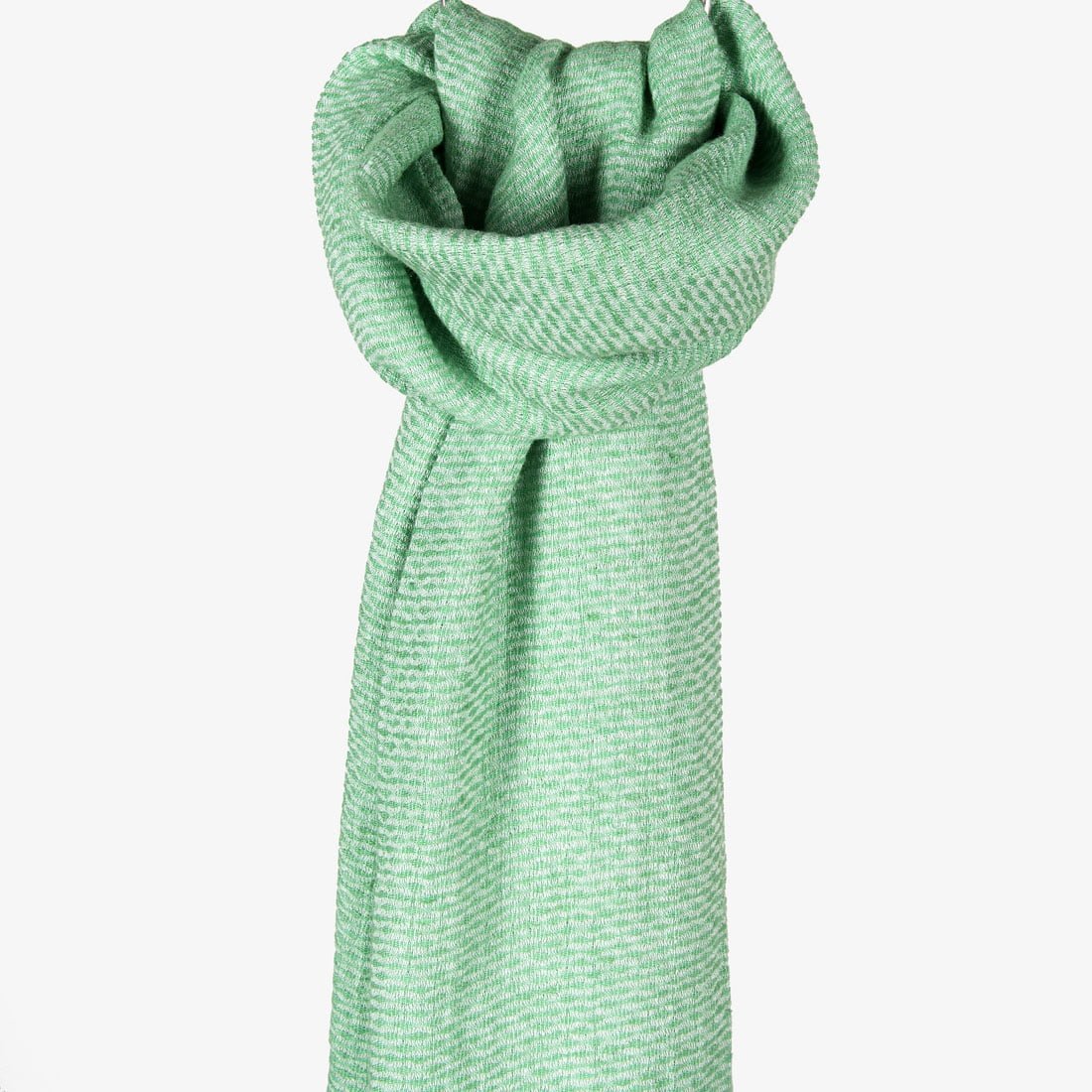 Lininis šalikas žaliai raštuotas (jo audinį išaudėme iš baltų ir špinatų žalumo verpalų). Trumposios gaminio kraštinės su baltais kutais. Kad šalikas būtų minkštas, švelnus, malonus liesti, išskalbėme jį specialia technologija. Puoškitės patys, dovanokite draugams ir artimiesiems, kurie dievina natūralumą ir žalią spalvą.