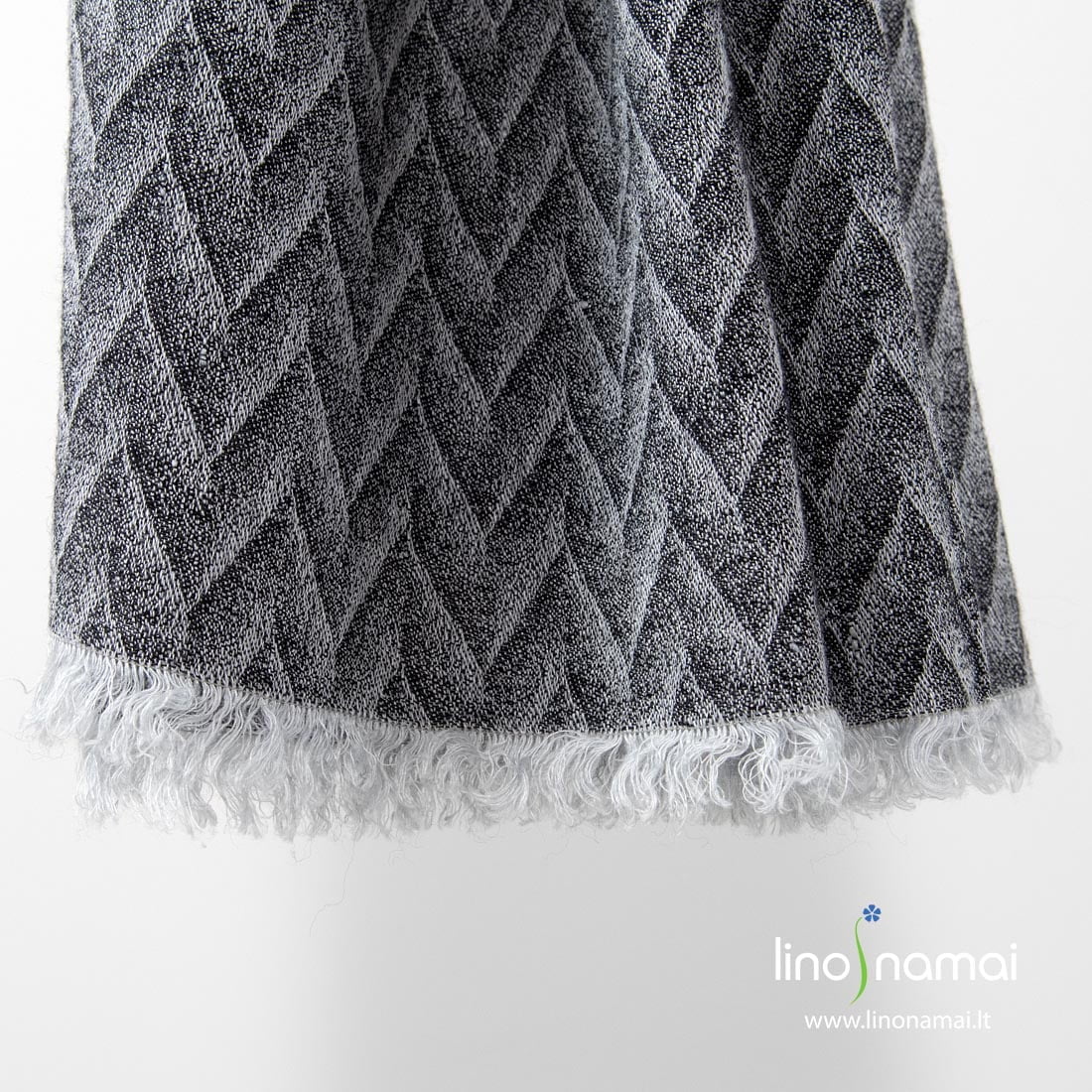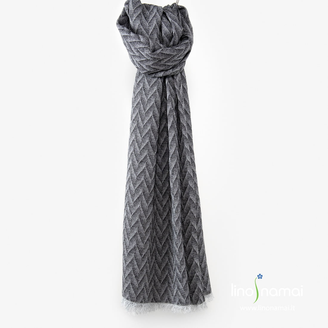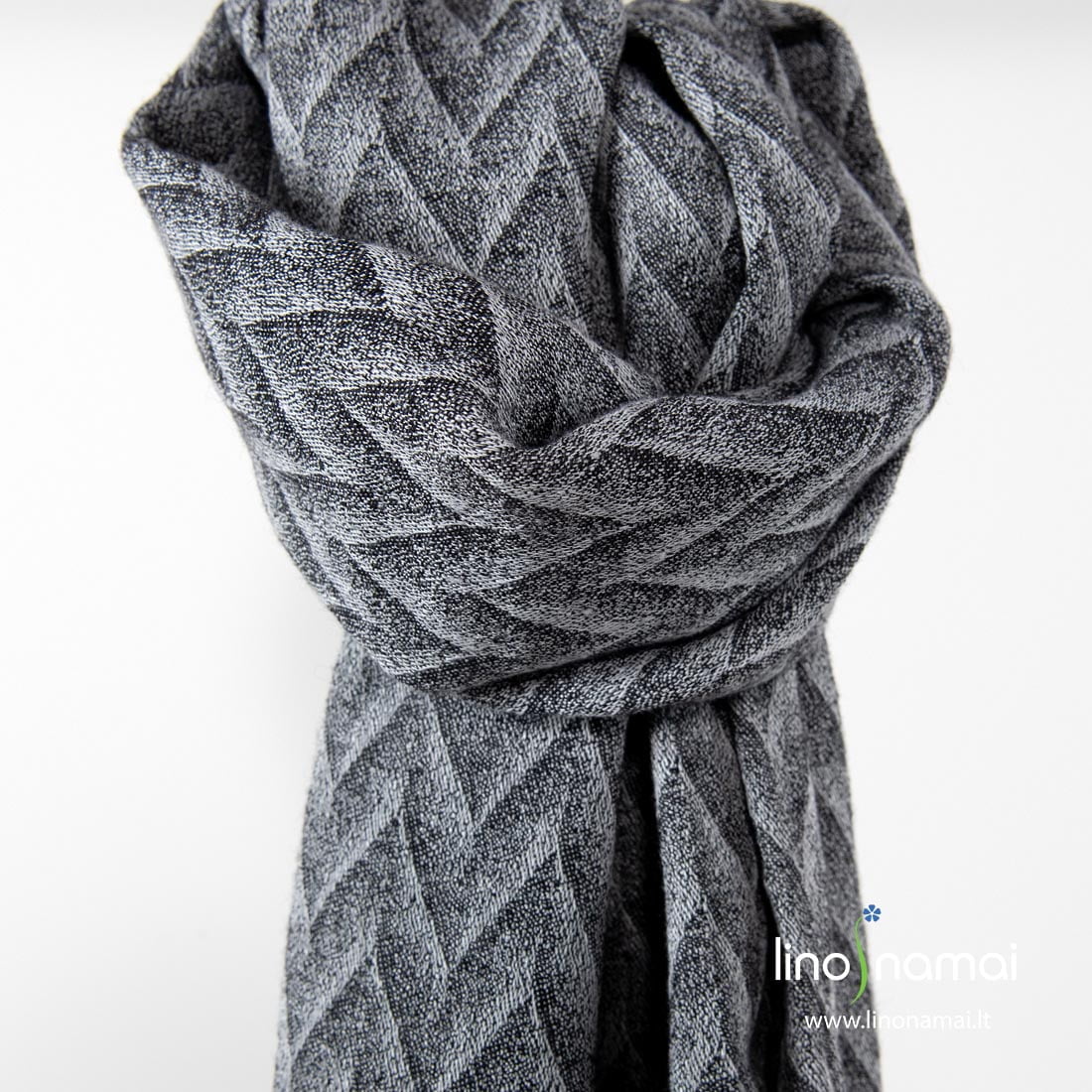 Lino-vilnos šalikas melsvai, juodai raštuotas. Jo zigzago raštą išaudėme iš juodų ir melsvai pilkų lino ir vilnos verpalų. Trumpąsias kraštines papuošėme 2cm ilgio pešiotais kutais. Gaminio audinį suminkštinome, padarėme švelnų specialia skalbimo technologija. Vilna tikrai šildo. Ir linas turi tokią pačią savybę. Įsitikinsite įsigiję šį šaliką. O kur dar įdomus, akį traukiantis 3D raštas!