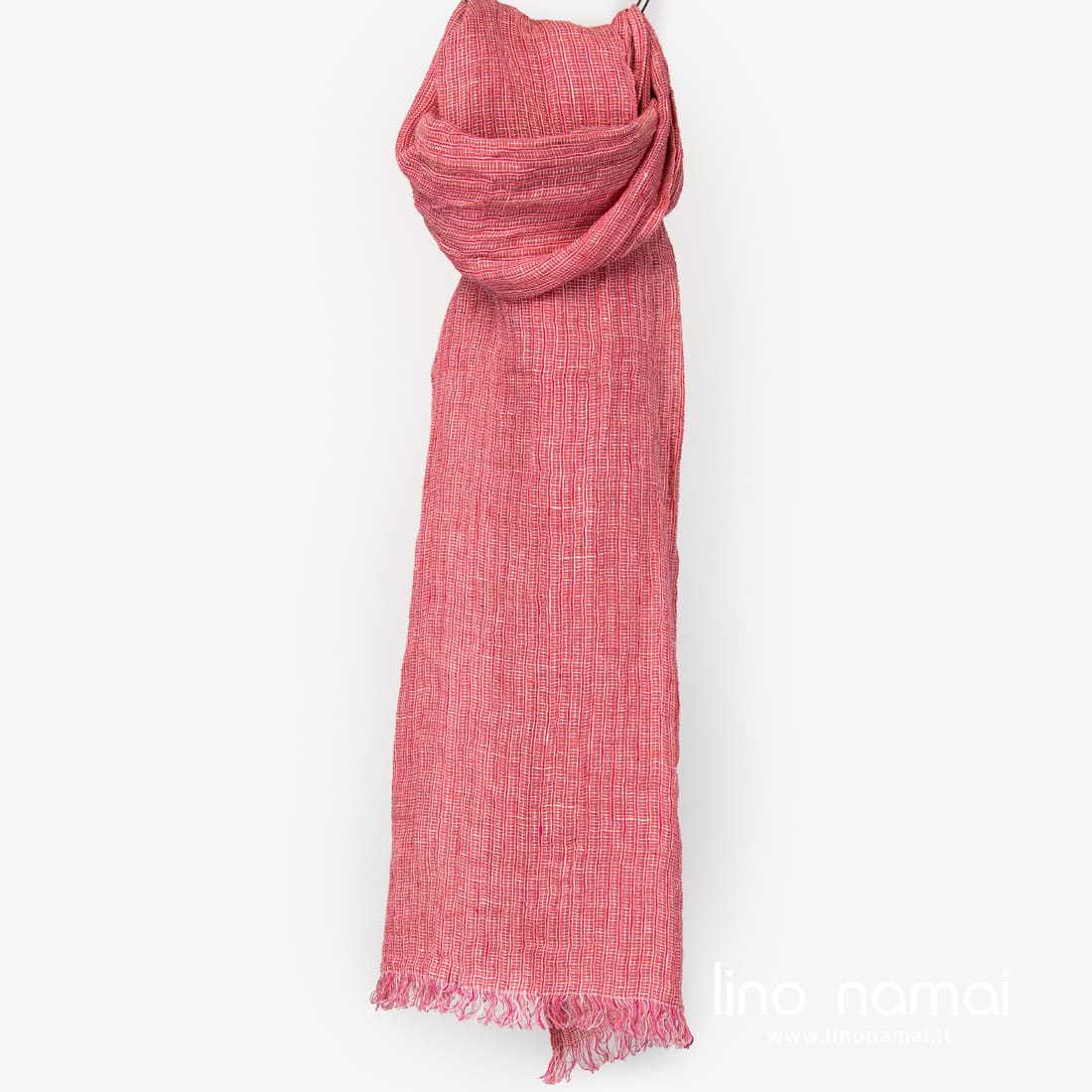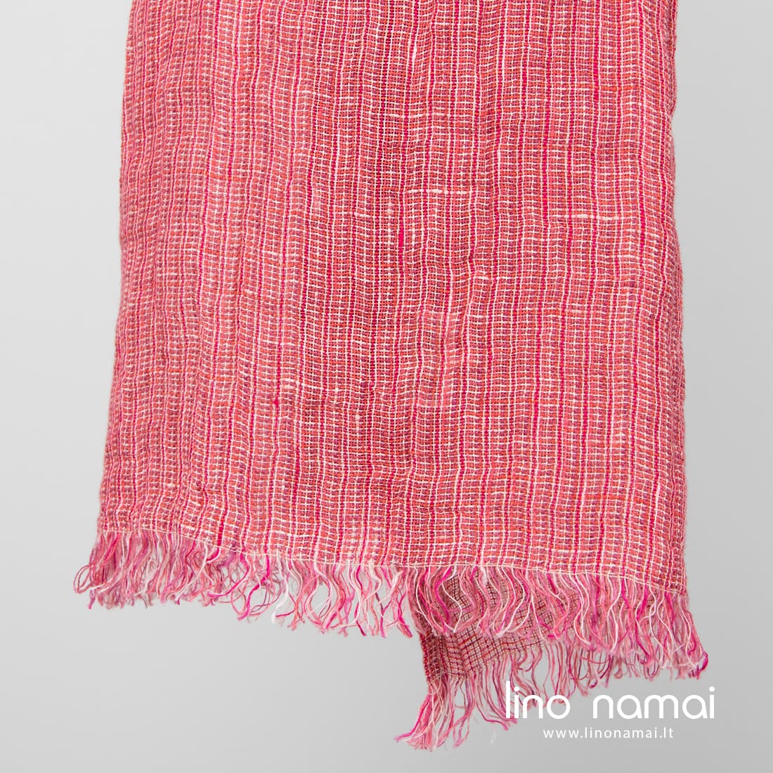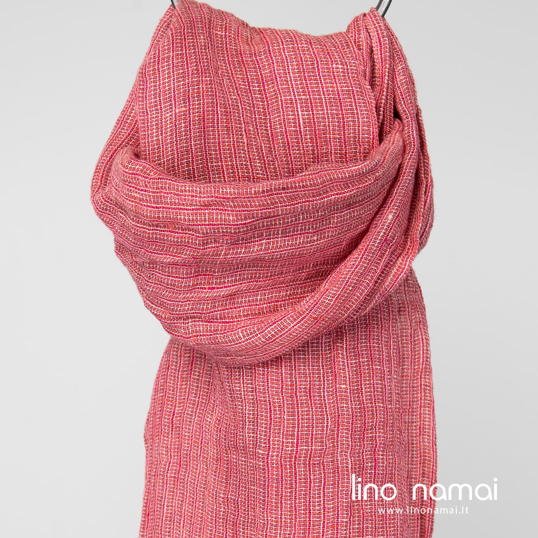 - Lininis rožinis šalikas iš smulkiais langeliais austo audinio.