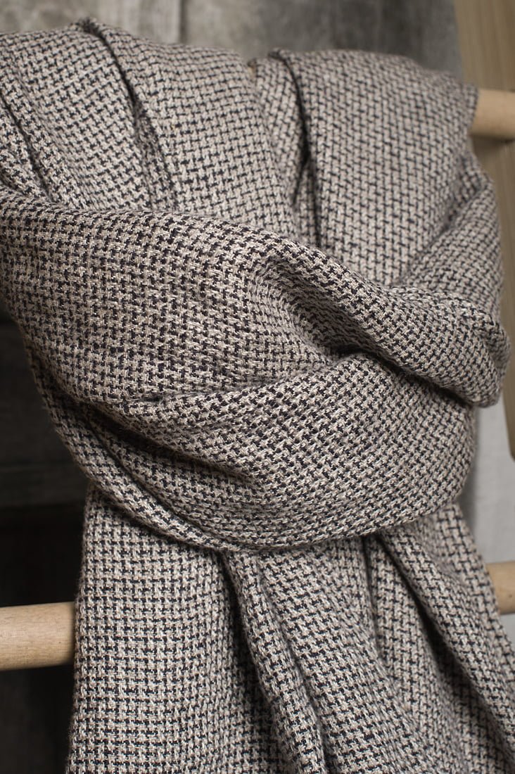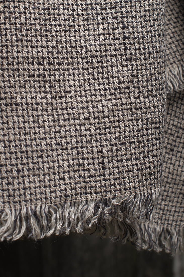 Pilkas skalbto lino šalikas autas įdomiu geometriniu juodu raštu. Pagyvintas pilkais ir juodais 2,5 cm pešiotais kutais. Gan ilgas, švelnus ir šiltas šalikas sukurtas klasikinio stiliaus mėgėjams.
