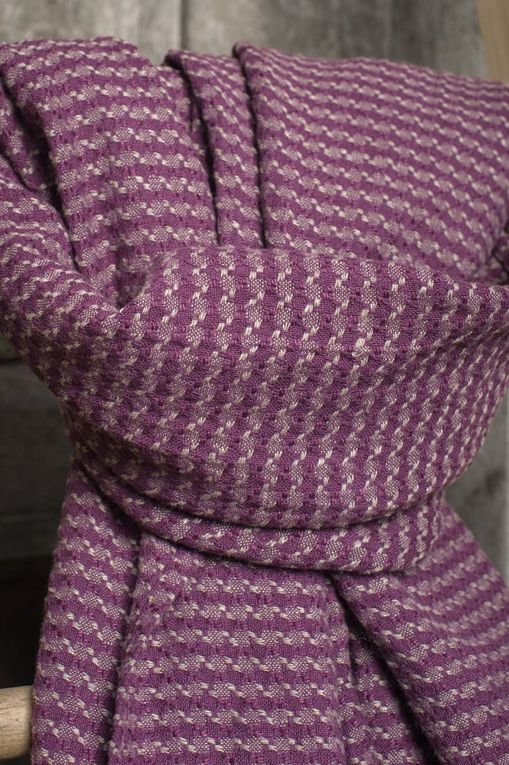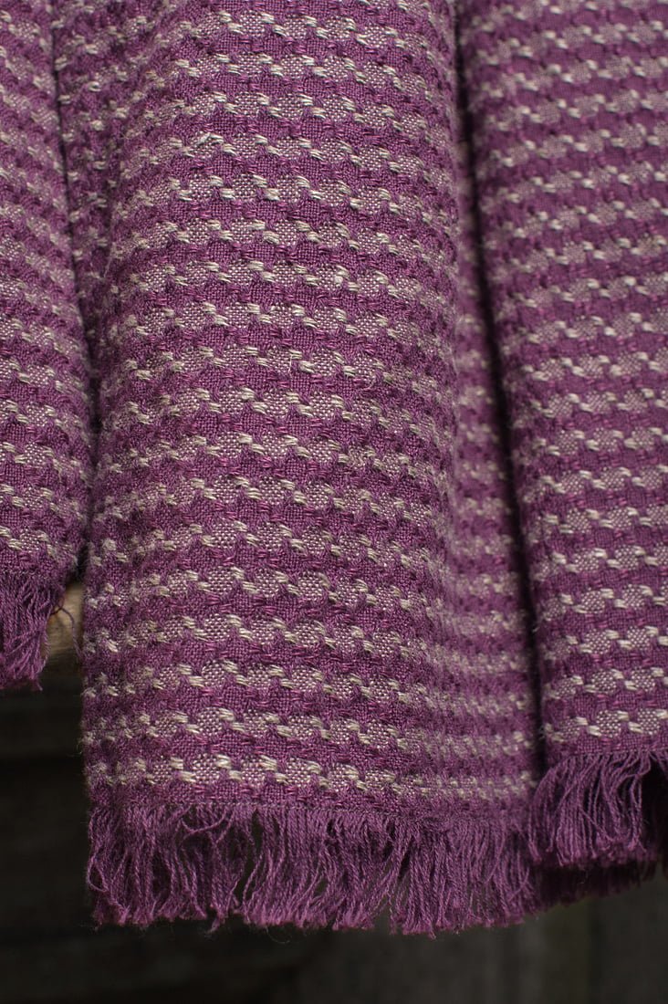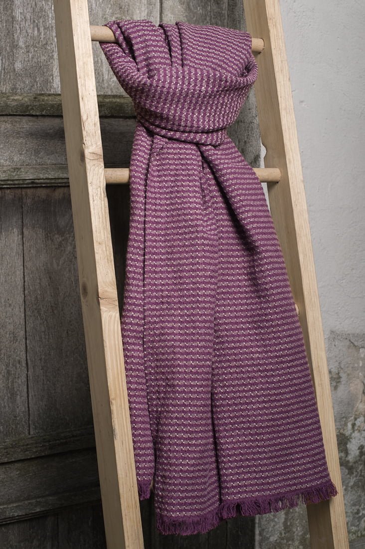 Raštuotas šaliko audinys išaustas iš violetinių ir pilkų verpalų. Trumposios kraštinės puoštos 2,5 cm ilgio pešiotais kutais. Šis skalbto lino / medvilnės šalikėlis ne tik papuoš Jūsų garderobą, bet ir suteiks šilumos, kurios taip reikia vėjuotomis dienomis.