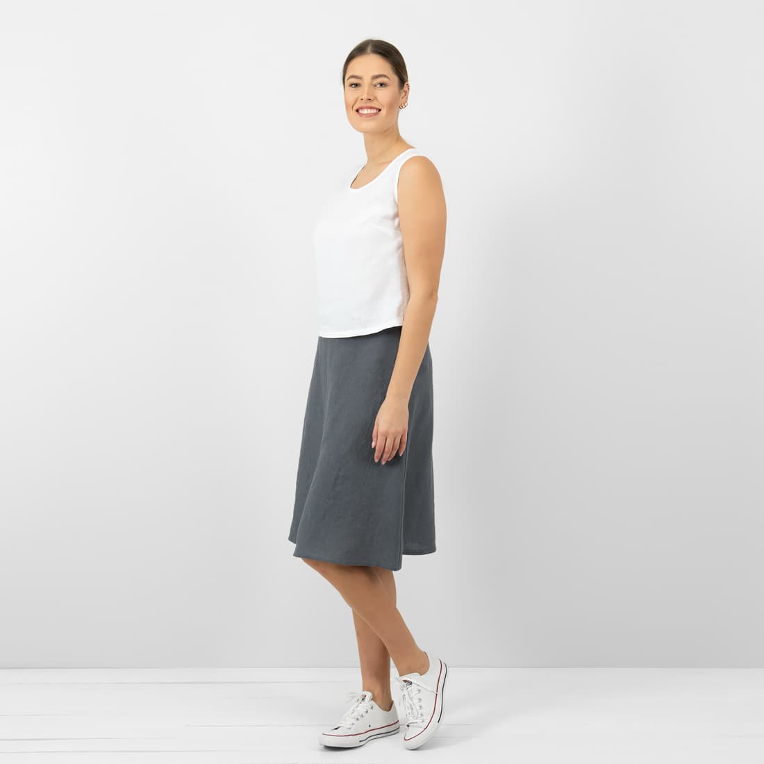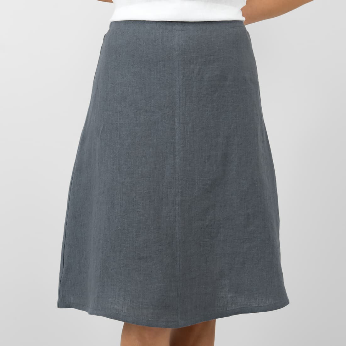 • Lininis melanžinis sijonas, suausti tamsūs mėlynai pilki ir tamsios metalo pilkos spalvos verpalai