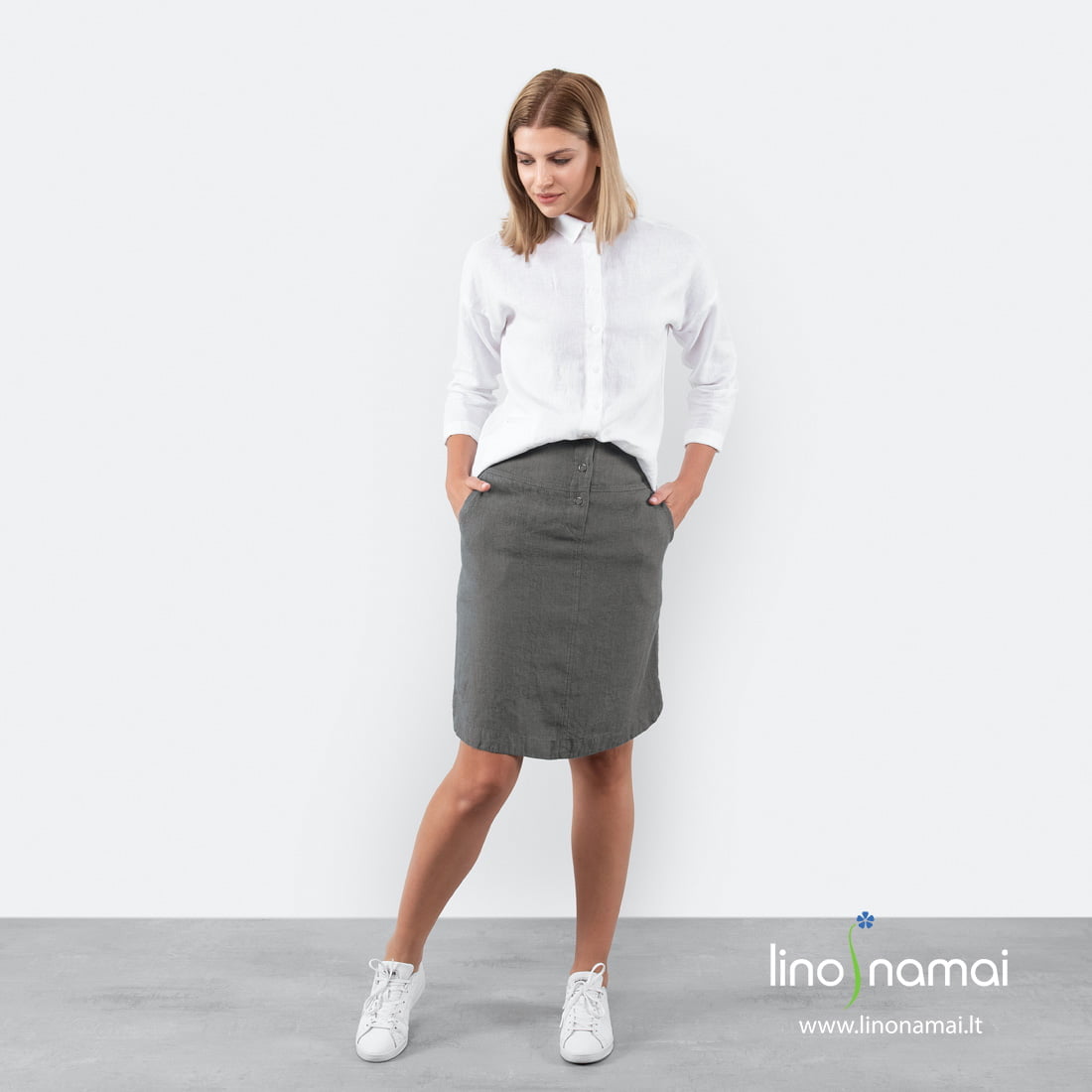 Lininis pilkas sijonas „Minis“. Gaminio audinyje suaudėme tamsius rusvai pilkus ir melsvai pilkus verpalus, todėl audinys turi vos juntamą melsvą atspalvį. Patogus sportinis dizainas nepaliks abejingų: užsiimkite smagia veikla atrodydamos nepakartojamai!