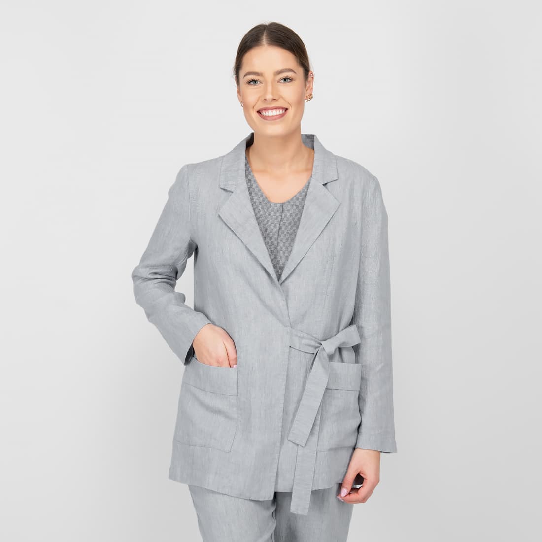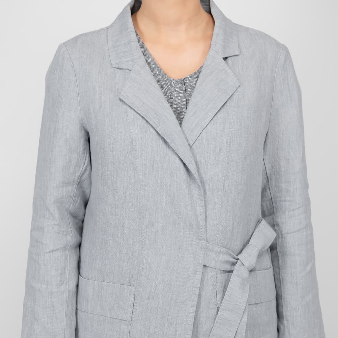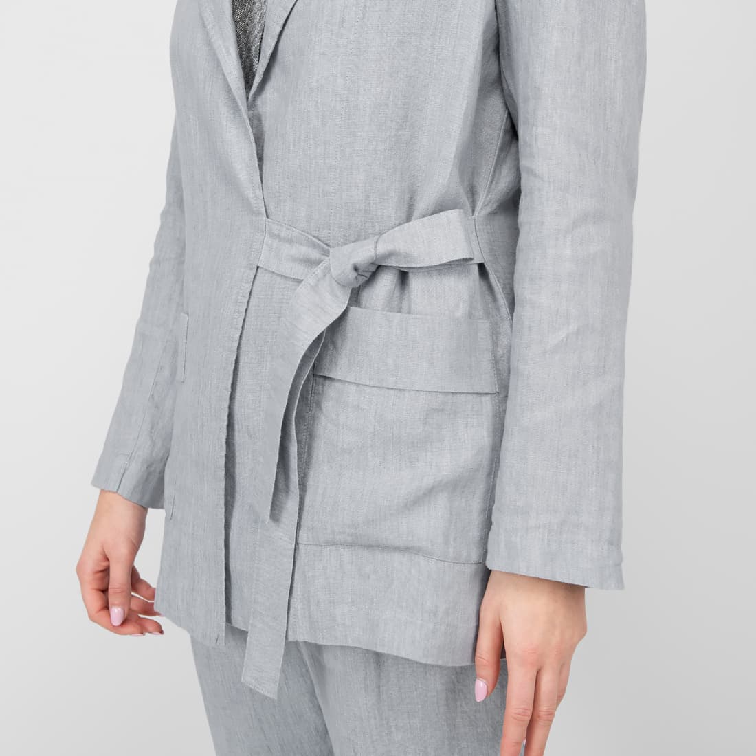 • Lininis pilkas švarkas surišamas plačiu diržu šone