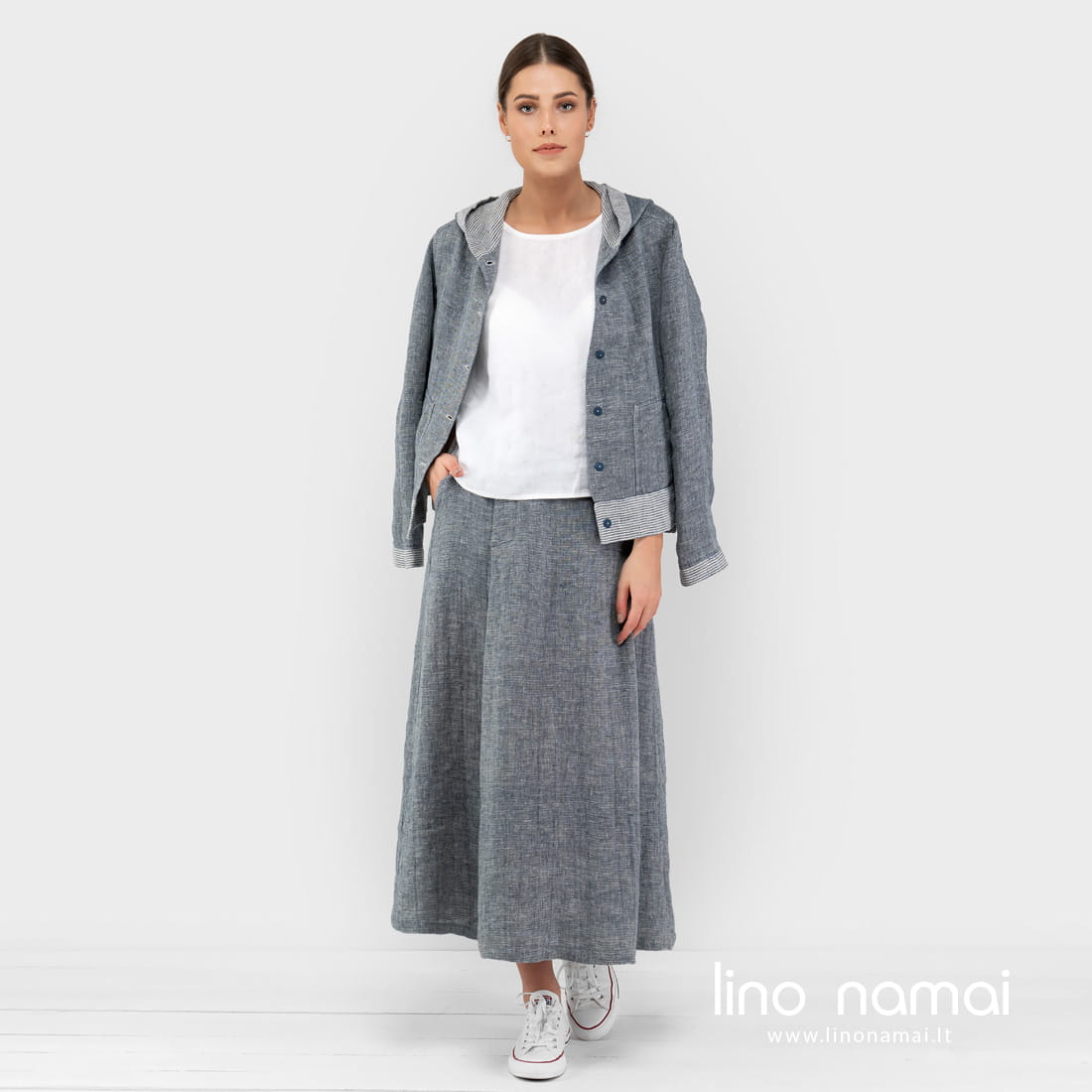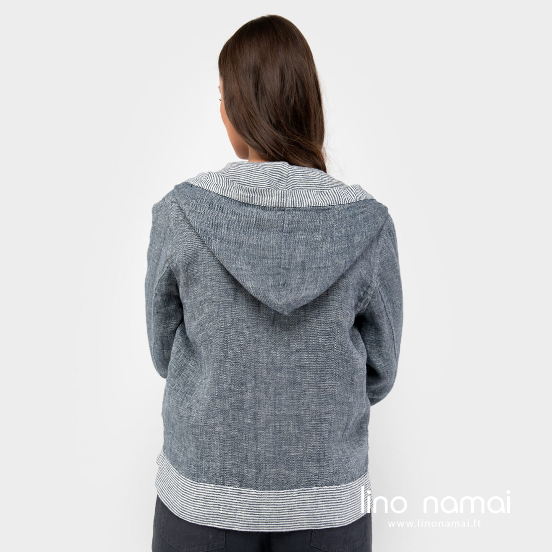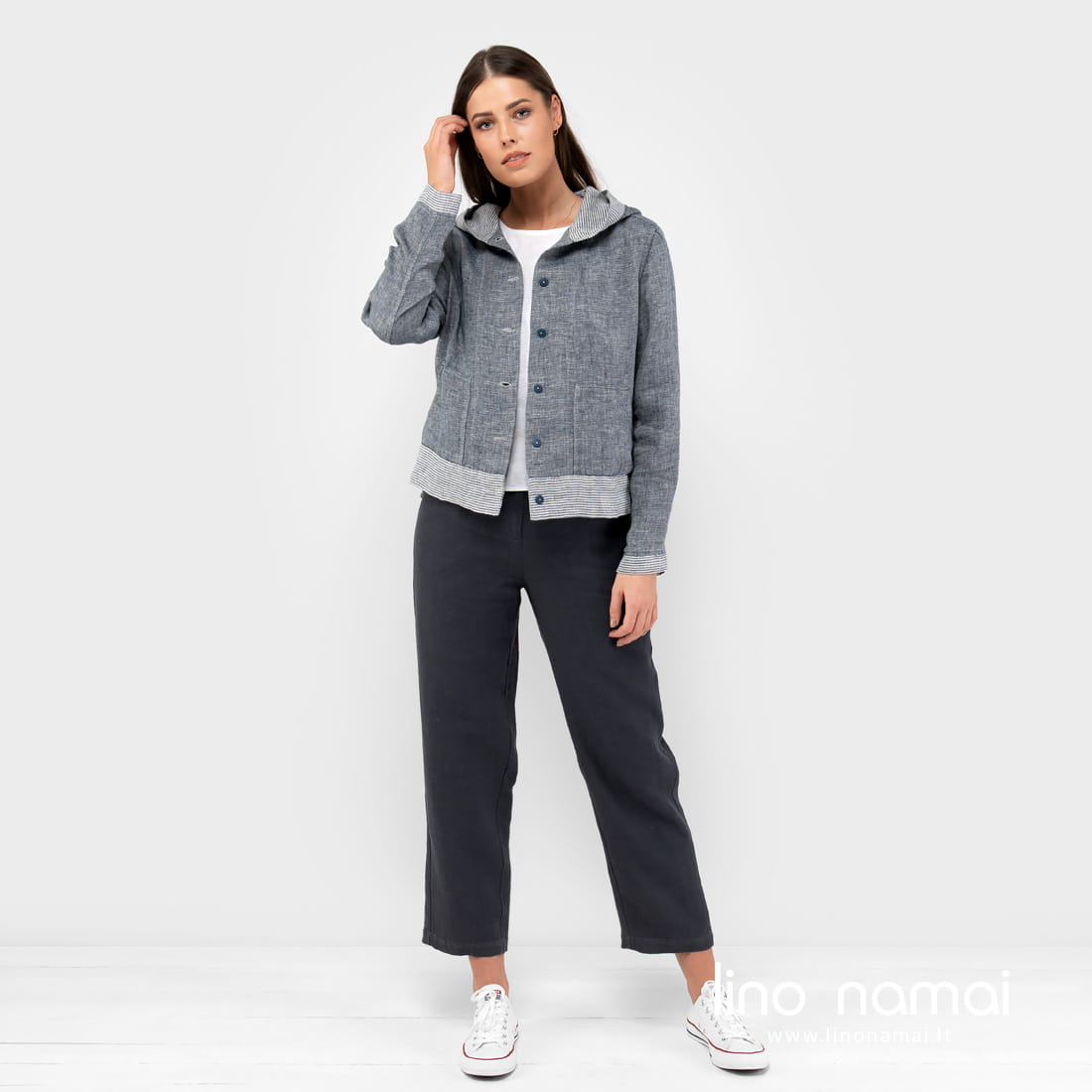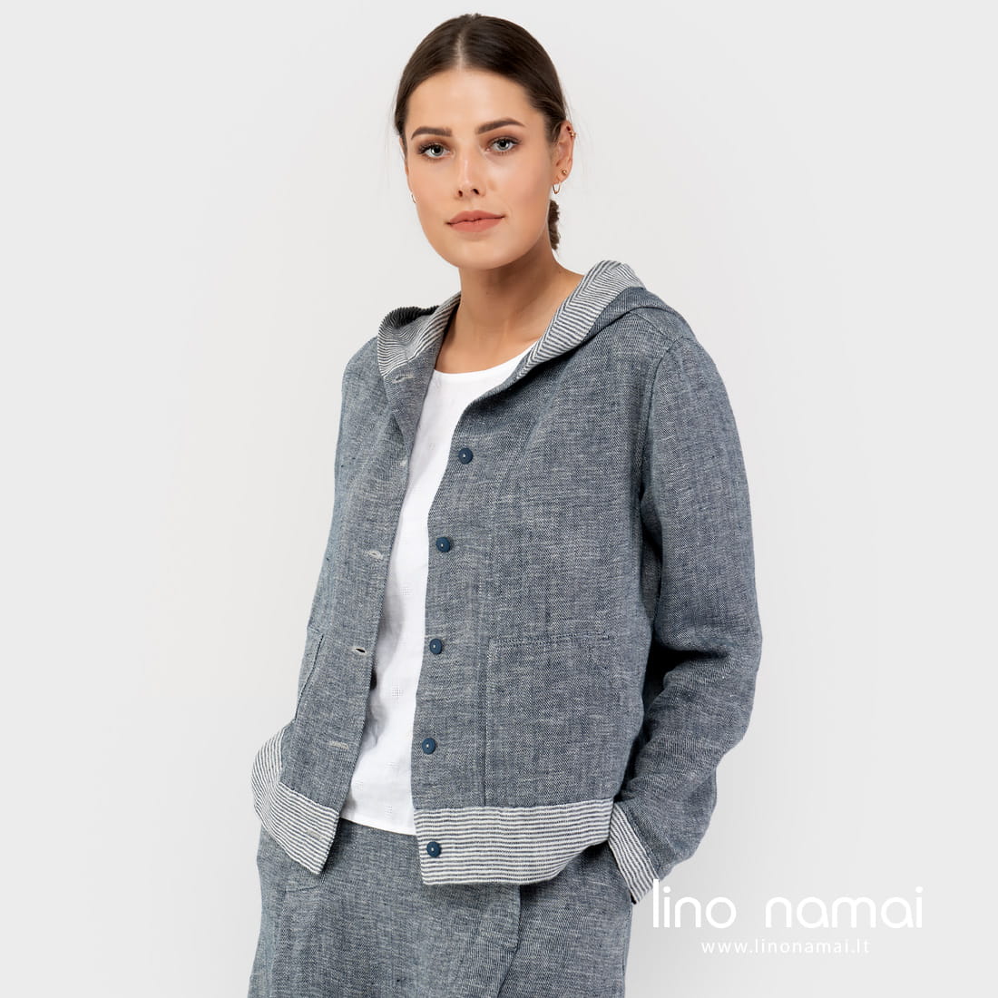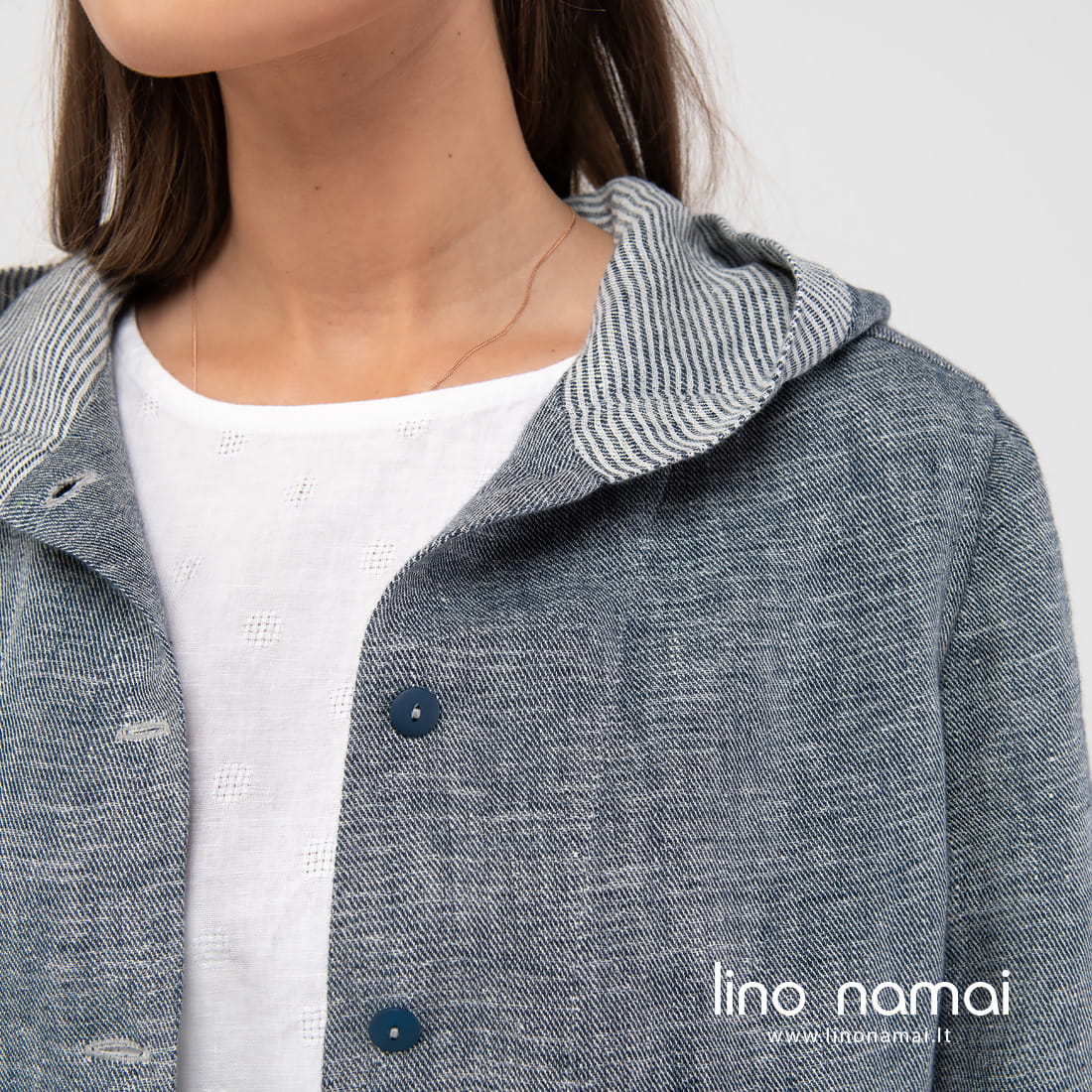 Trumpas sportinio stiliaus lininis švarkas. Šiam gaminiui parinkome dvipusį audinį: viena pusė austa įstrižais ruoželiais, kita pusė su horizontaliais dryžiukais. Naudojome pieno baltumo, kreminės spalvos (gelsvai baltus) ir mėlynai juodus verpalus. Švarkelio detalės iš abiejų audinio pusių: dryžuoti rankogaliai, švarko apačia, gobtuvo kantelis ir vidus subtiliai pagyvina drabužį.