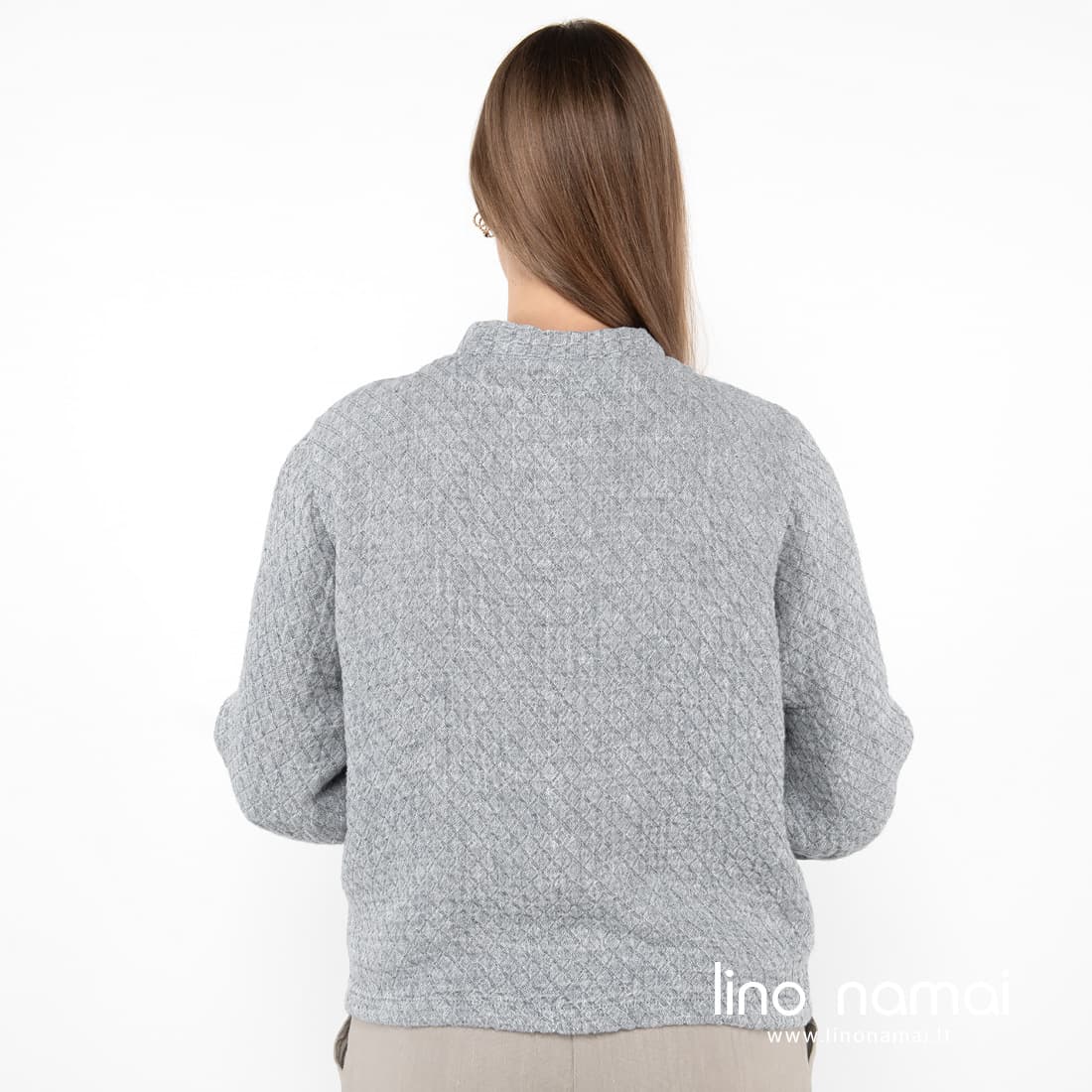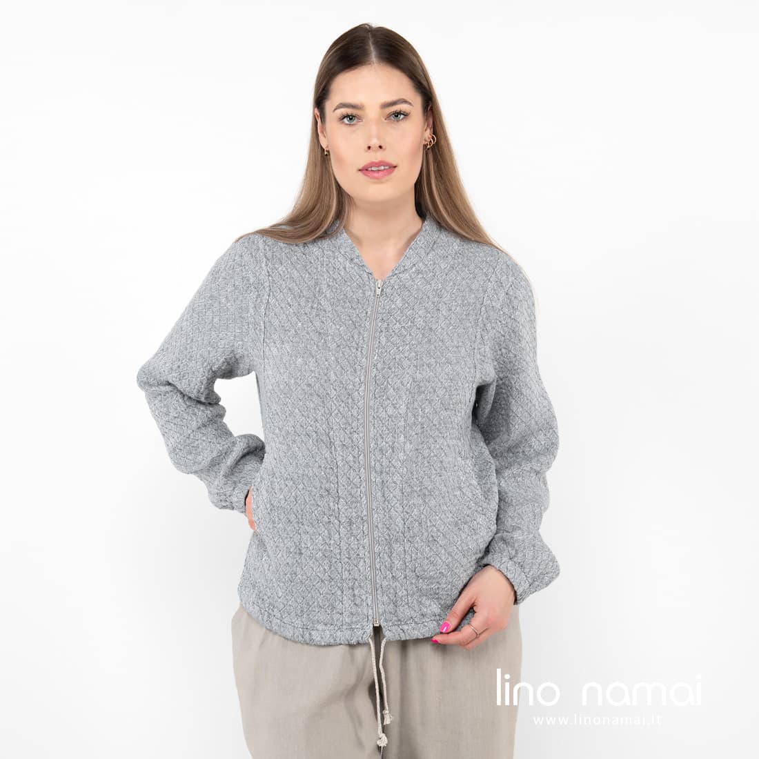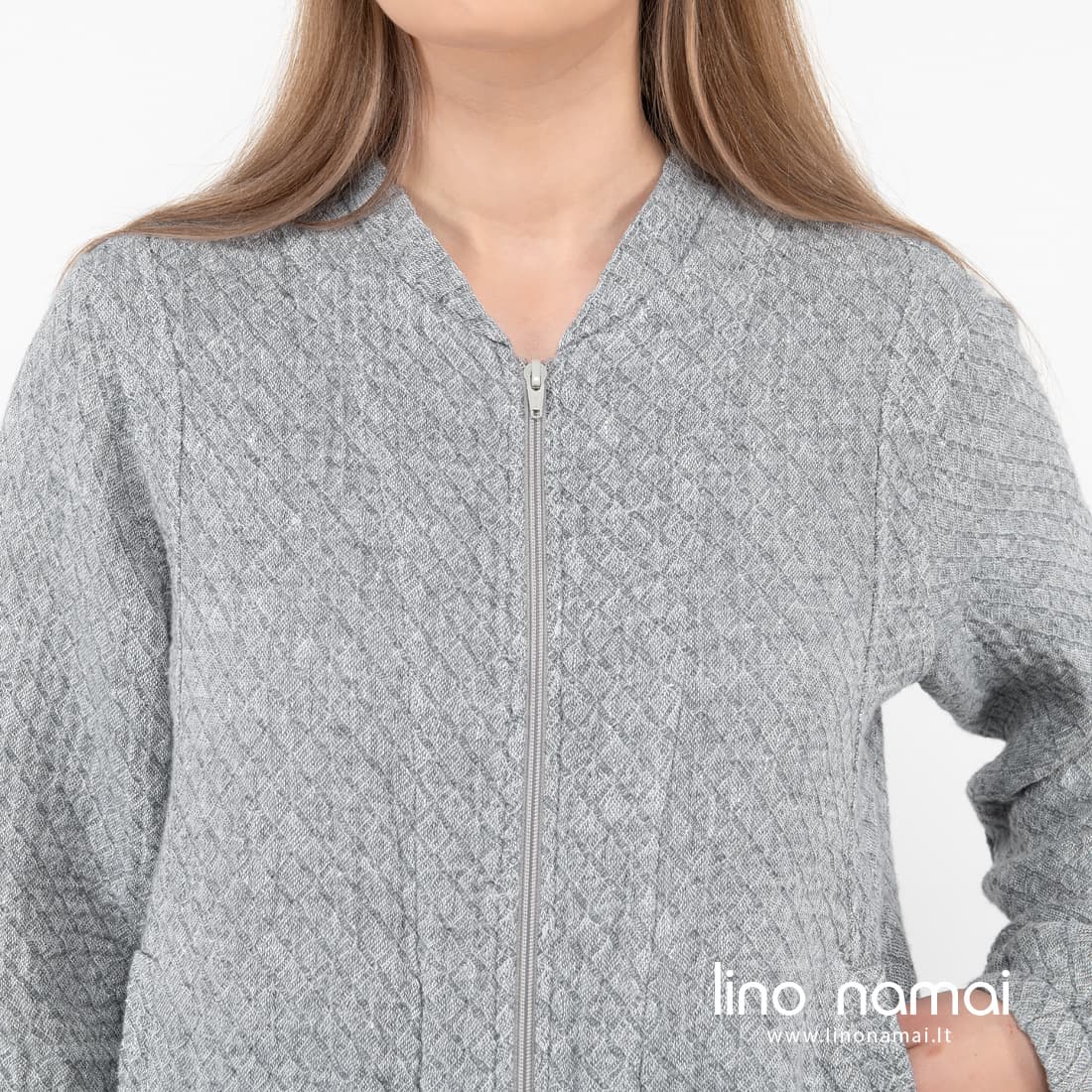 • MANGA lininis pilkas bomber stiliaus švarkelis iš žakardinio rombais austo baltai pilko audinio
