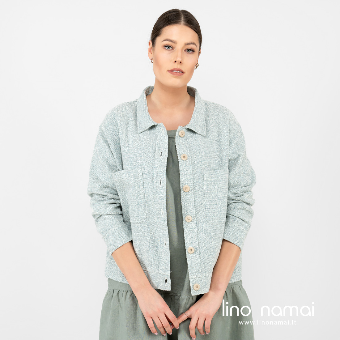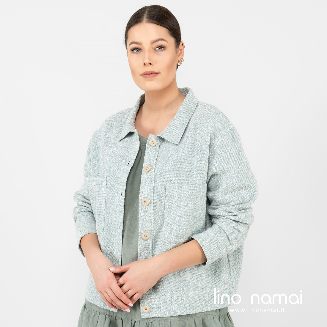 • Puslininis žalsvas švarkelis su 2 kišenėm priekyje.