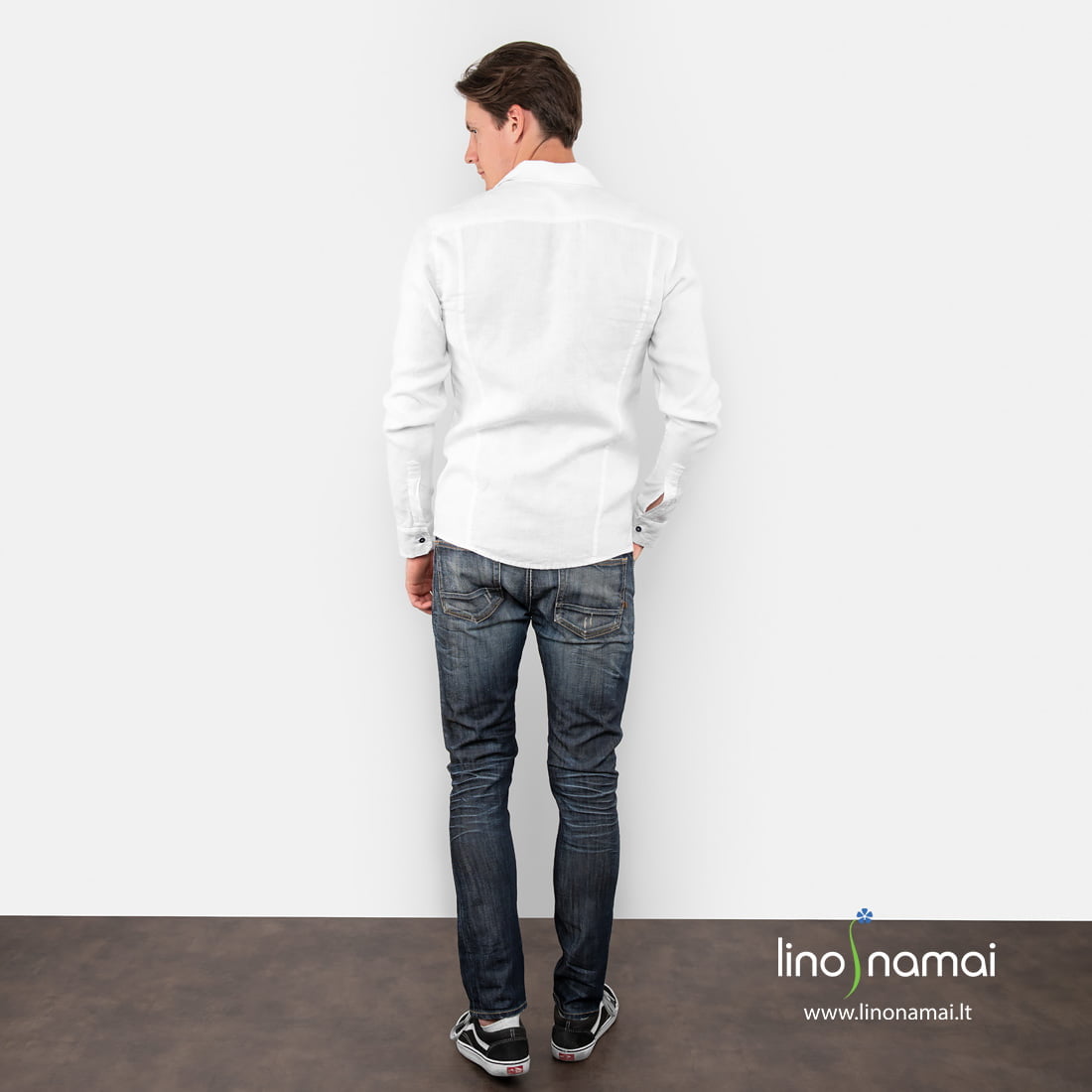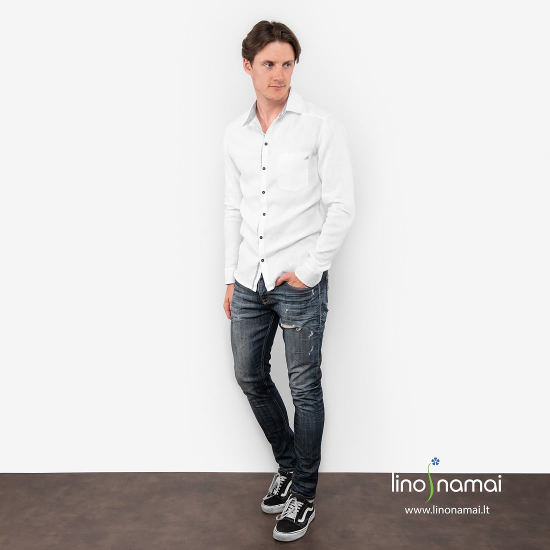 Lininiai ryškiai balti vyriški marškiniai su akį traukiančiomis kitokio audinio detalėmis – labai puošnus drabužis. Jei norite laisvo, neįpareigojančio stiliaus, derinkite su džinsais. Su šiais marškiniais vasarą biure atrodysite nepriekaištingai tvarkingai ir kartu nenuobodžiai. Drąsiai puoškitės ir švenčių progomis – baltas linas visad atrodys nekasdieniškas.