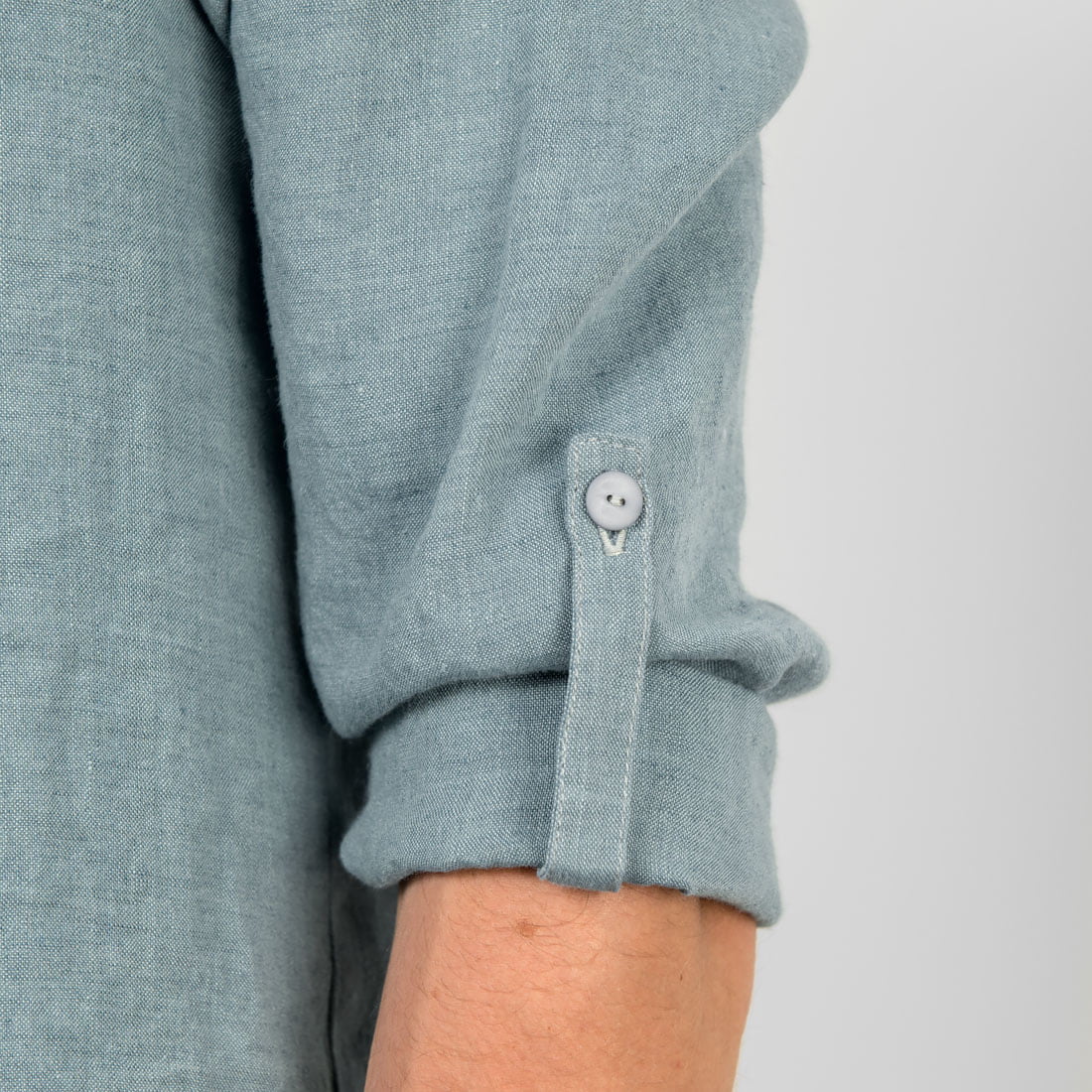 Melsvi lininiai vyriški marškiniai iš audinio, austo iš akvamarino spalvos (šviesių melsvai žalsvų) ir tamsesnių žalsvai mėlynų verpalų. Šis jūros spalvos, lengvo, laidaus orui, vėsinančio lino drabužis – idealus pasirinkimas vasarai.