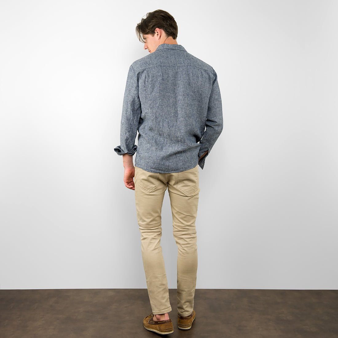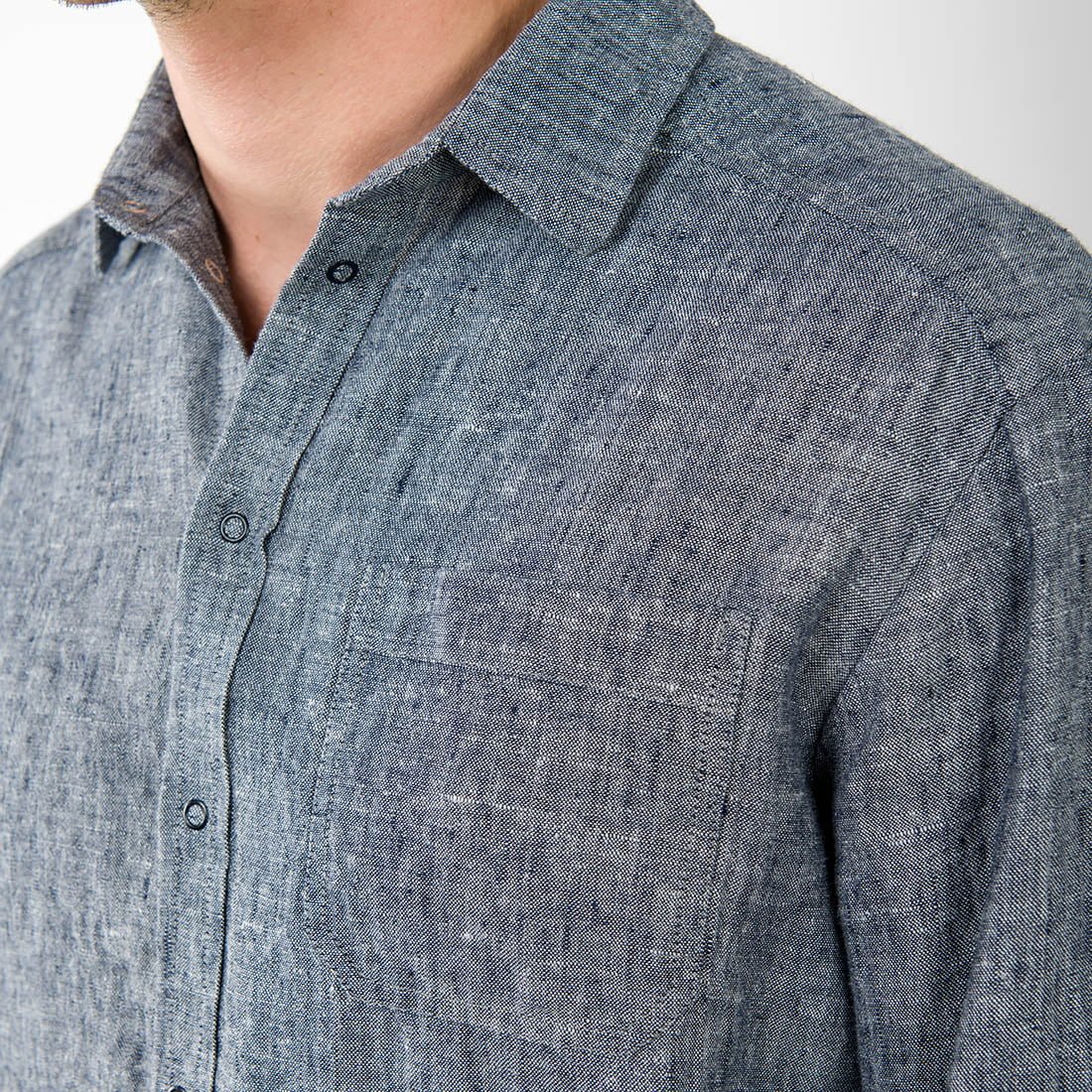 Mėlyni margi lininiai vyriški marškiniai iš dviejų spalvų (labai tamsiai mėlynais ir šviesiais melsvai pilkais) verpalais austo audinio. Nenutolę nuo klasikinio dizaino, tačiau traukiantys akį savo spalva, savo margumu.