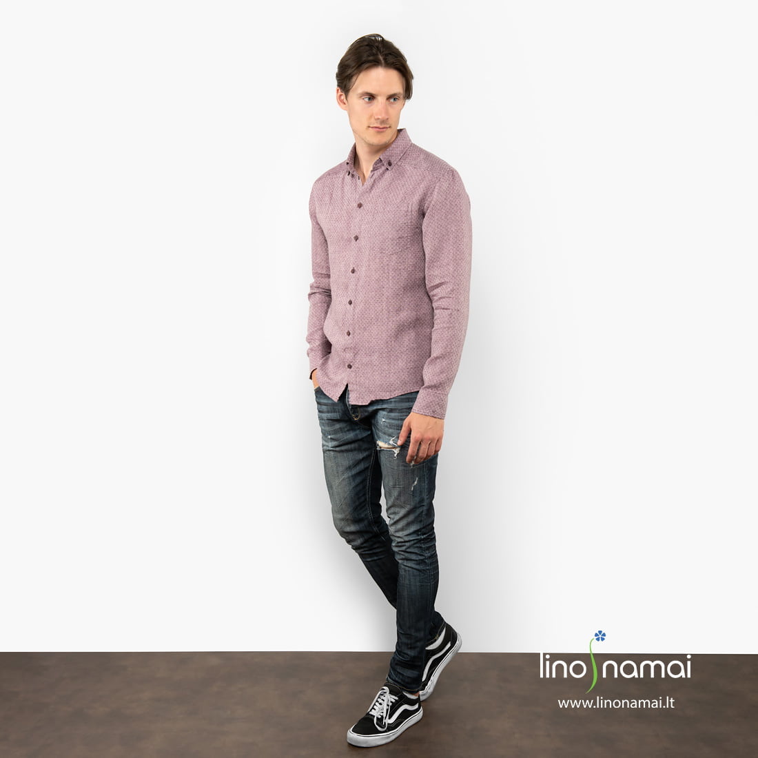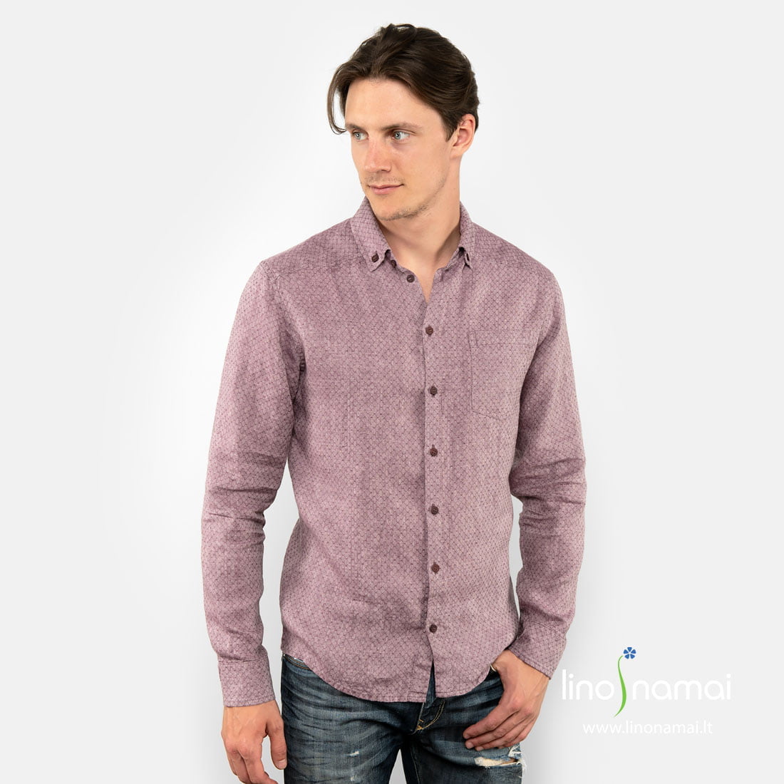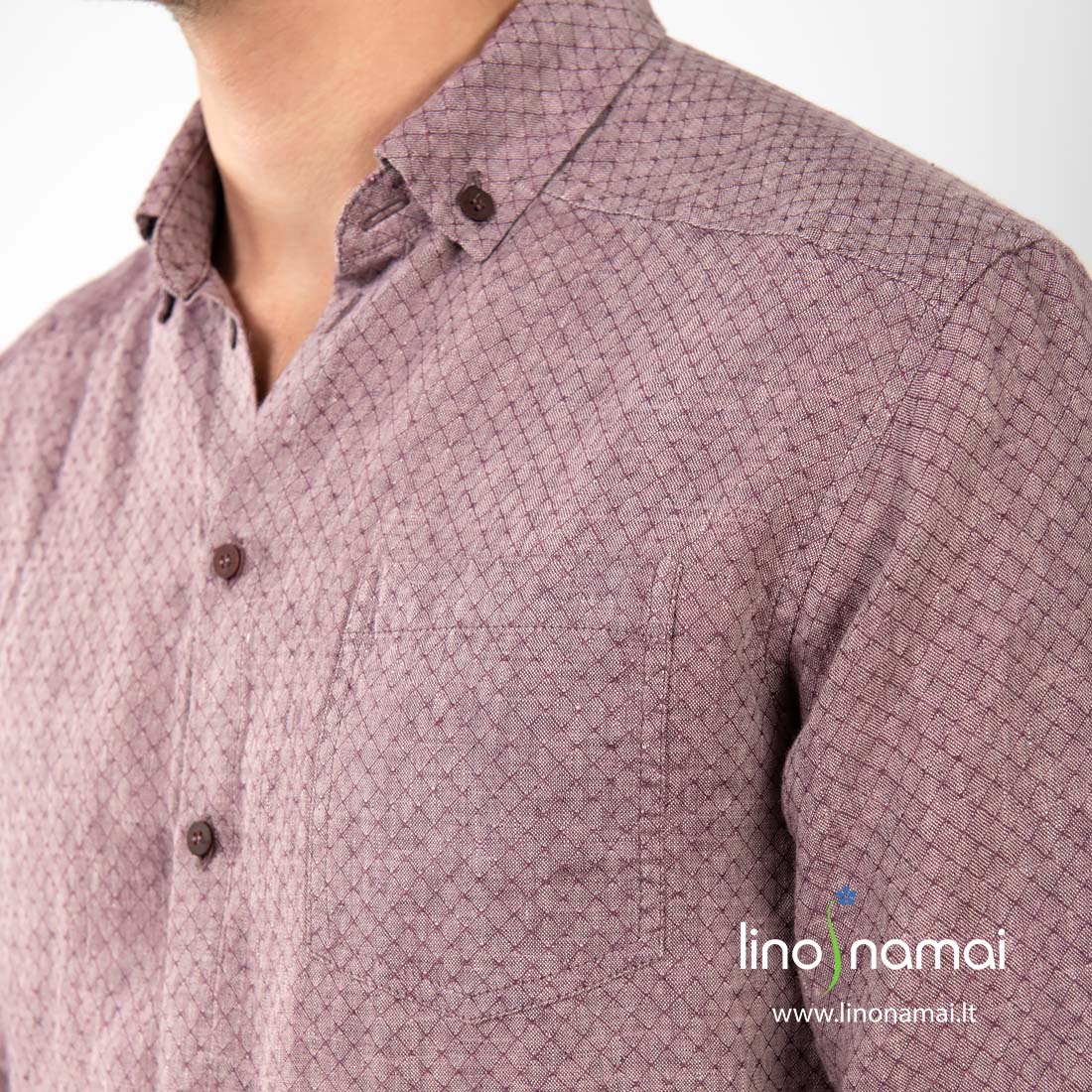 Violetinių vyriškų lininių marškinių audinys austas rombų raštu iš tamsiai violetinių ir šviesių alyvinės spalvos verpalų. Dėl savo puošnaus rašto ir akį traukiančios spalvos ypač tinka šventinėms progoms. Derindami su džinsais galite dėvėti ir kasdien. Tai universalus drabužis kiekvienai dienai, kiekvienai progai.