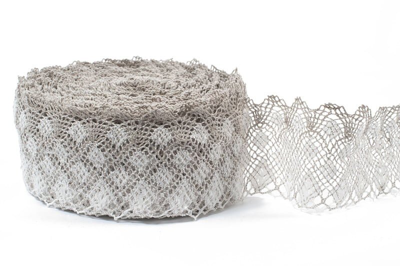 Lininis nėrinys, nertas iš baltų ir natūralios spalvos (rusvai pilkų, nedažytų) lininių verpalų. Dvispalvis platus nėrinys puikiai tiks dekoruoti drabužiams, patalynei, stalo gaminiams.