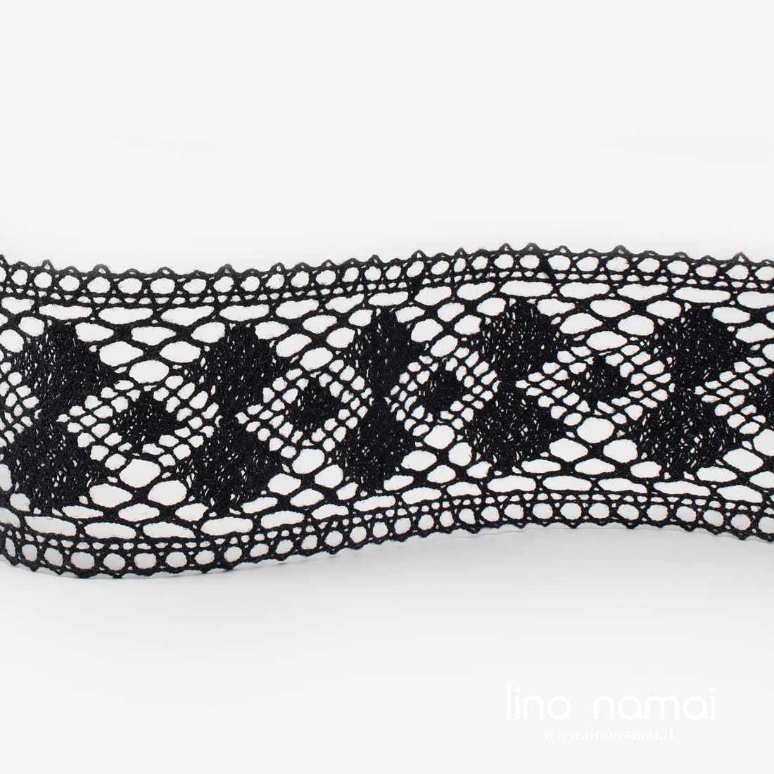 Lininis nėrinys juodas geometriniu raštu, nertas įvairaus dydžio rombais. Skirtas dekoruoti drabužiams ir namų tekstilės gaminiams.