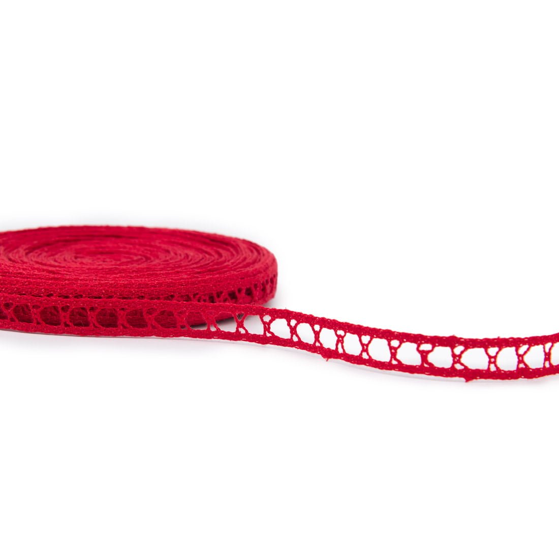 Lininis nėrinys raudonas (spalva itin intensyvi) siauras, nertas didelėmis akimis. 1,2cm pločio.
