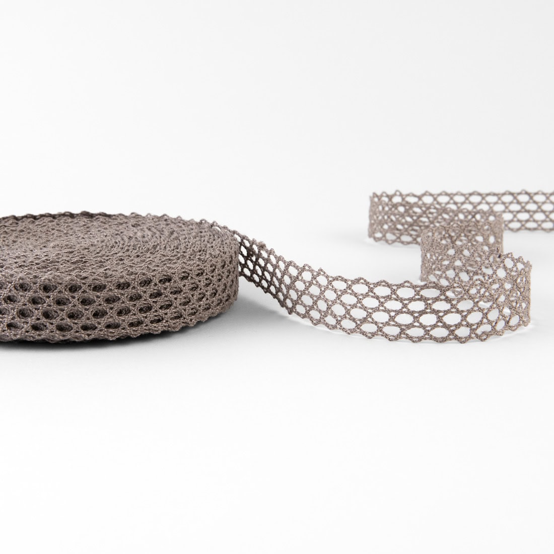 • Lininis nėrinys rudai pilkas 2cm pločio
