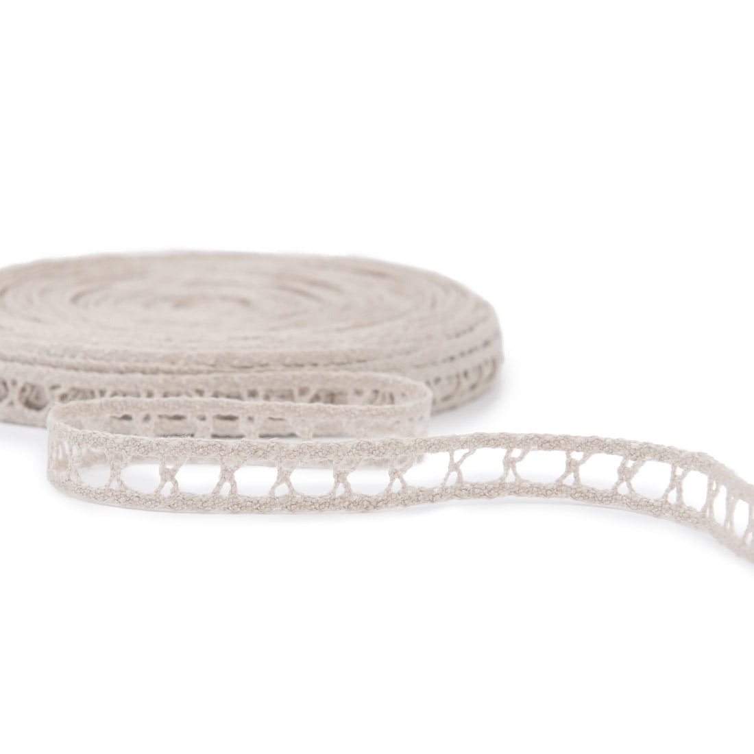 Lininis nėrinys smėlinės (šviesios pilkšvai rusvos) spalvos, nertas didelėmis akimis. Itin siauras (plotis tik 1,2cm). Tiks smulkiems gaminiams, siuviniams papuošti.