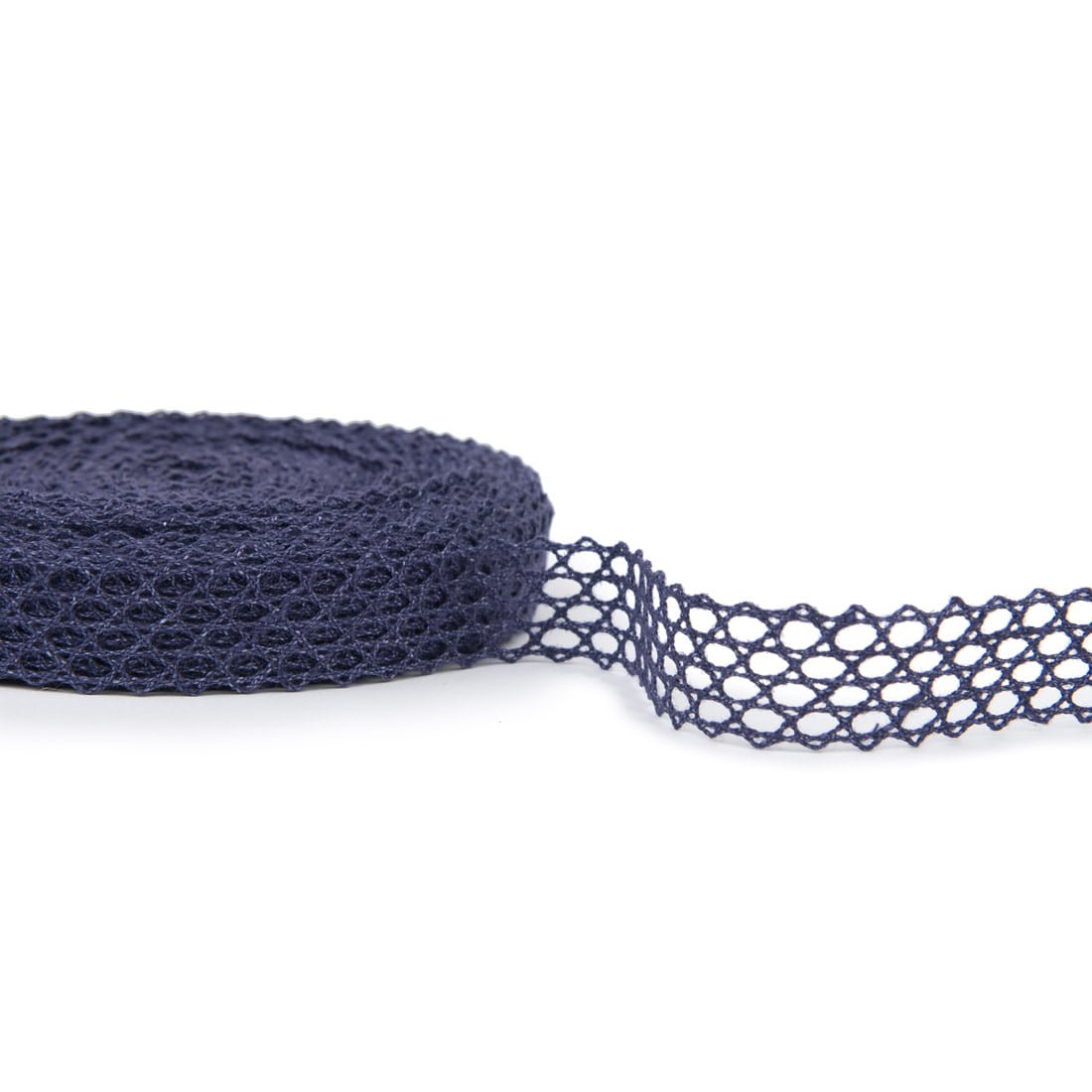 Lininis nėrinys tamsiai mėlynas (su lengvu violetiniu atspalviu), nertas „tinkliuko“ raštu. Siauras (plotis 2,3cm). Puoškite patalynės užvalkalus, drabužių kraštelius, staltieses, užuolaidas.