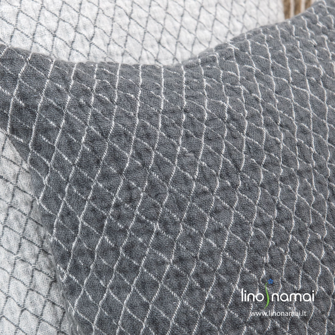 Lininis pilkas pagalvėlės užvalkaliukas baltais rombeliais, užsegamas užtrauktuku. Tobulai dermei, kurioje visi dekoro elementai turi tas pačias spalvas, sukurti Jums rekomenduojame veidrodinį šio gaminio atspindį (užvalkaliuką su pilkų linijų rombeliais pieno baltumo fone) ir dvipusį žakardinį pilkai-baltą kutuotą pledą tokiu pačiu audinio raštu. Skalbtas minkštas 100% linas atneš jaukumo ir natūralumo į Jūsų namus, pledas ir pagalvėlės kvies patogiai įsikurti ant sofos, papuoš miegamojo lovą.
