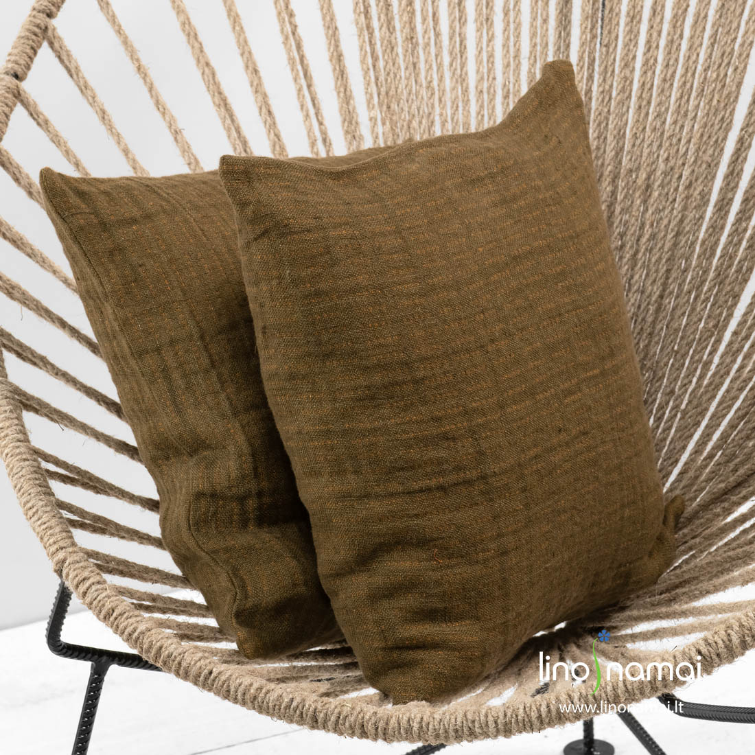 Lininis rusvai žalias pagalvėlės užvalkaliukas su jį pagyvinančiais įaustais auksinės rudos spalvos dryžiukais. Užsegamas užtrauktuku: pagalvėlę pervilksite per kelias akimirkas, ji stabiliai laikysis viduje. Gaminio audinį išskalbėme specialia technologija, jis nepaprastai minkštas, švelnus, draugiškas odai. Iš šio dvipusio audinio pasiuvome ir pledą. Įsigykite kelis samanų spalvos užvalkaliukus, derinkite su rusvai žalia arba auksine ruda pledo puse, kurkite savo miegamajame jaukią atmosferą.