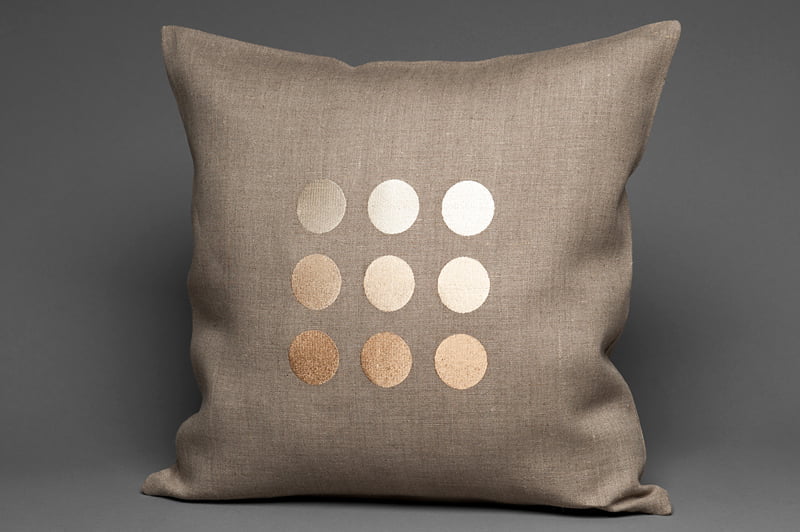 Pilkas lininis dekoratyvinės pagalvėlės užvalkaliukas puoštas siuvinėtais rusvais blizgiais burbuliukais. Užsegamas užtrauktuku.