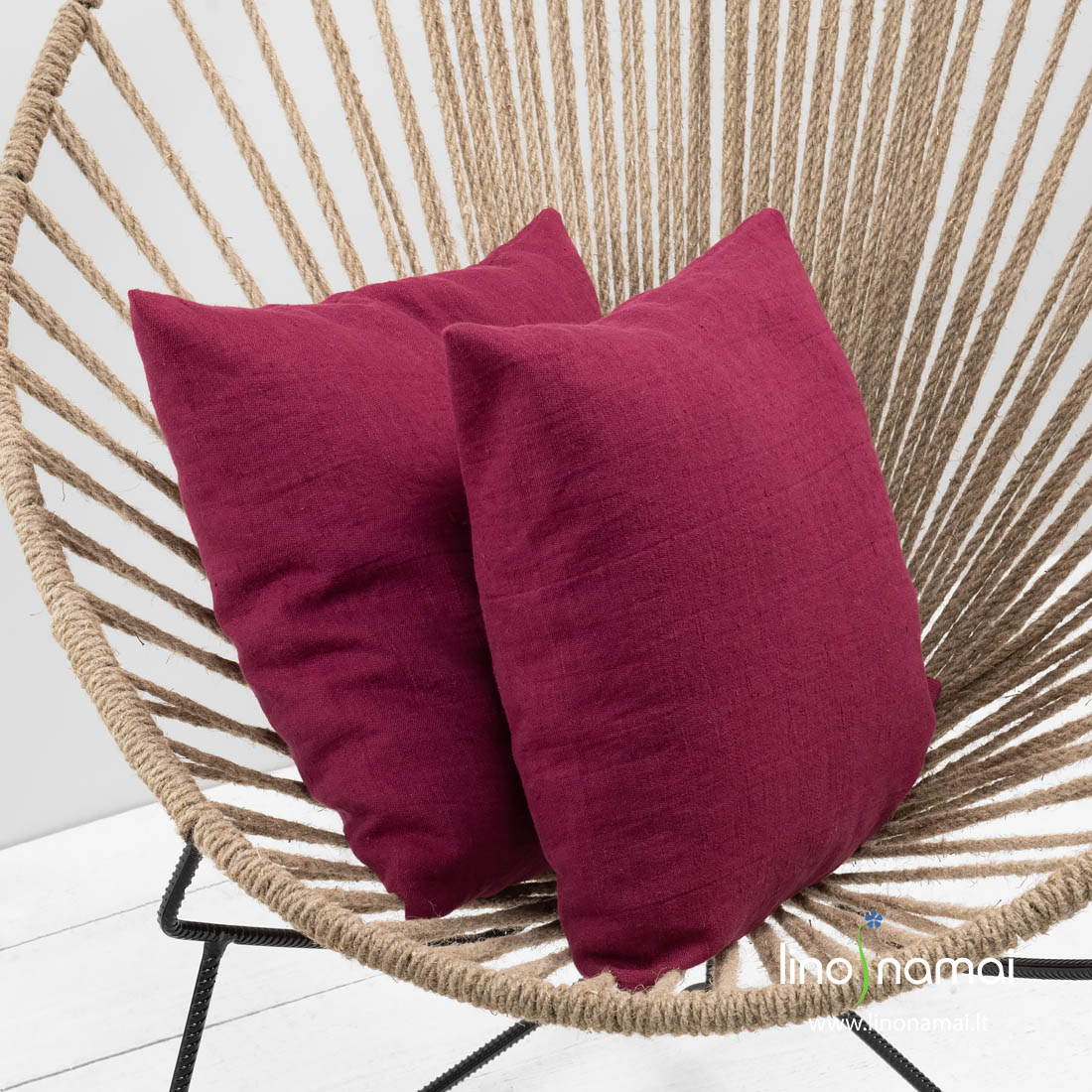 Puslininis vyšninės spalvos pagalvės užvalkaliukas iš žakardinio lino - medvilnės sudėties audinio. Užtrauktuko užsegimas leis užvalkaliuką pakeisti per kelias akimirkas. Gaminį pasiuvome iš minkšto, specialiu būdu skalbto audinio, todėl jis džiugins ne tik ryškia sodria spalva, bet ir švelniu, maloniu odai prisilietimu - jei nuspręstumėte nusnūsti ant sofos, dekoruotos spalvingomis pagalvėlėmis.