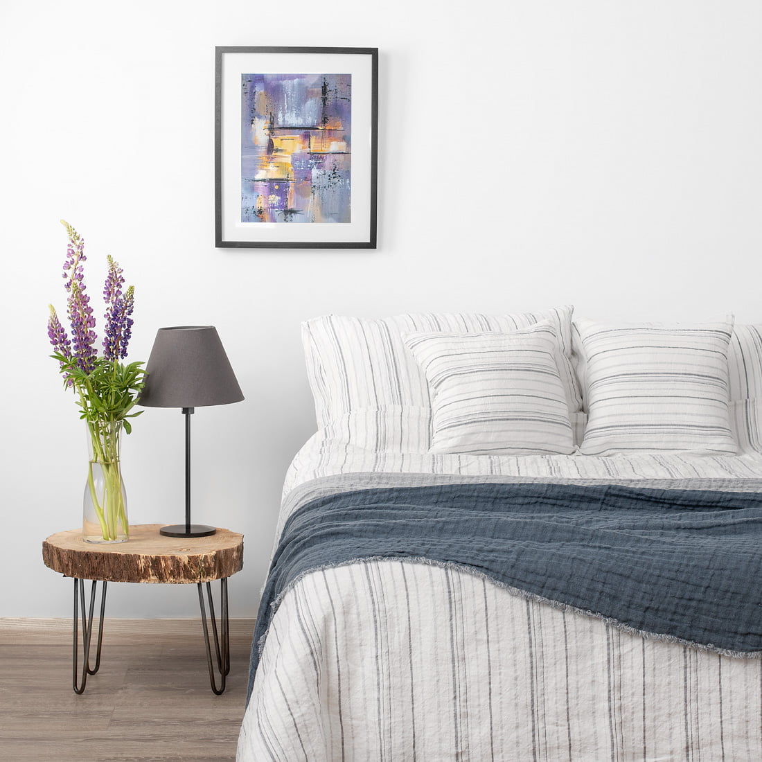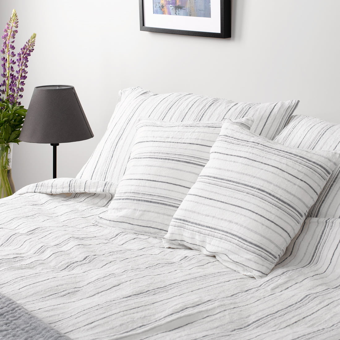 Balta dryžuota lininė patalynė susideda iš įvairių dydžių pagalvių, antklodžių užvalkalų ir paklodžių (su guma arba paprastai apsiūtų). Pieno baltumo (gelsvai baltame) fone išausti tamsiai pilki ir melsvai pilki dryžiai suteikia gaminiams skandinaviško subtilumo, gyvumo. Nelygi skalbto lino struktūra dar labiau sustiprina šį pojūtį. Prie dryžuotų užvalkalų priderinome šviesiai pilką paklodę. Minkšta ir švelni natūrali skalbto lino patalynė su pilkai dryžiukais tikrai papuoš Jūsų miegamąjį ir atneš ramų miegą.