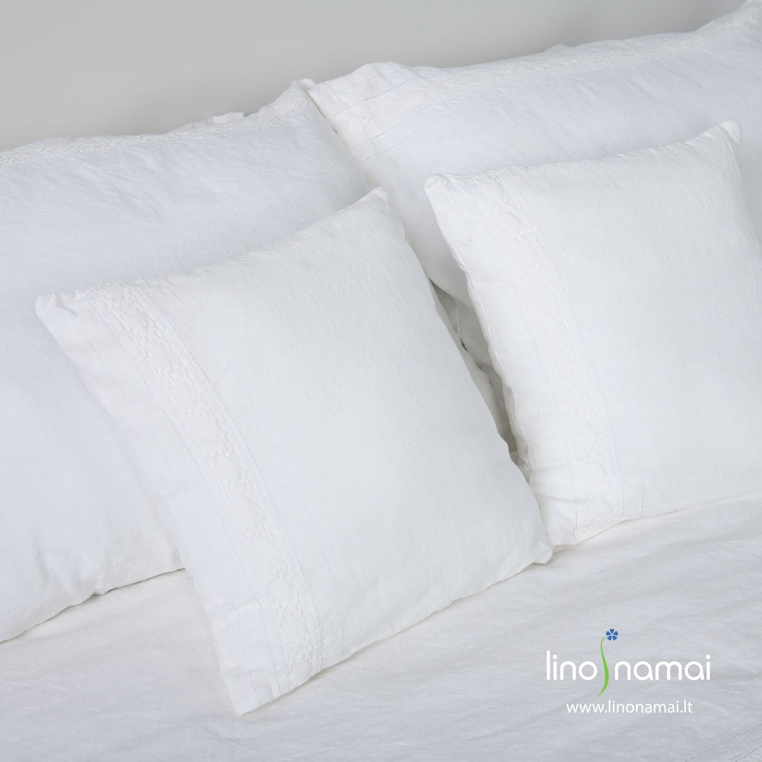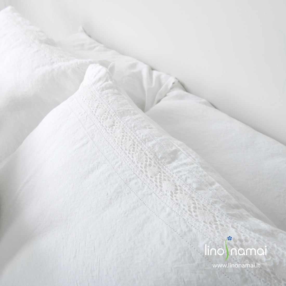 - Ryškiai baltas su nėriniais pagalvės užvalkalas su užkaitu šone.