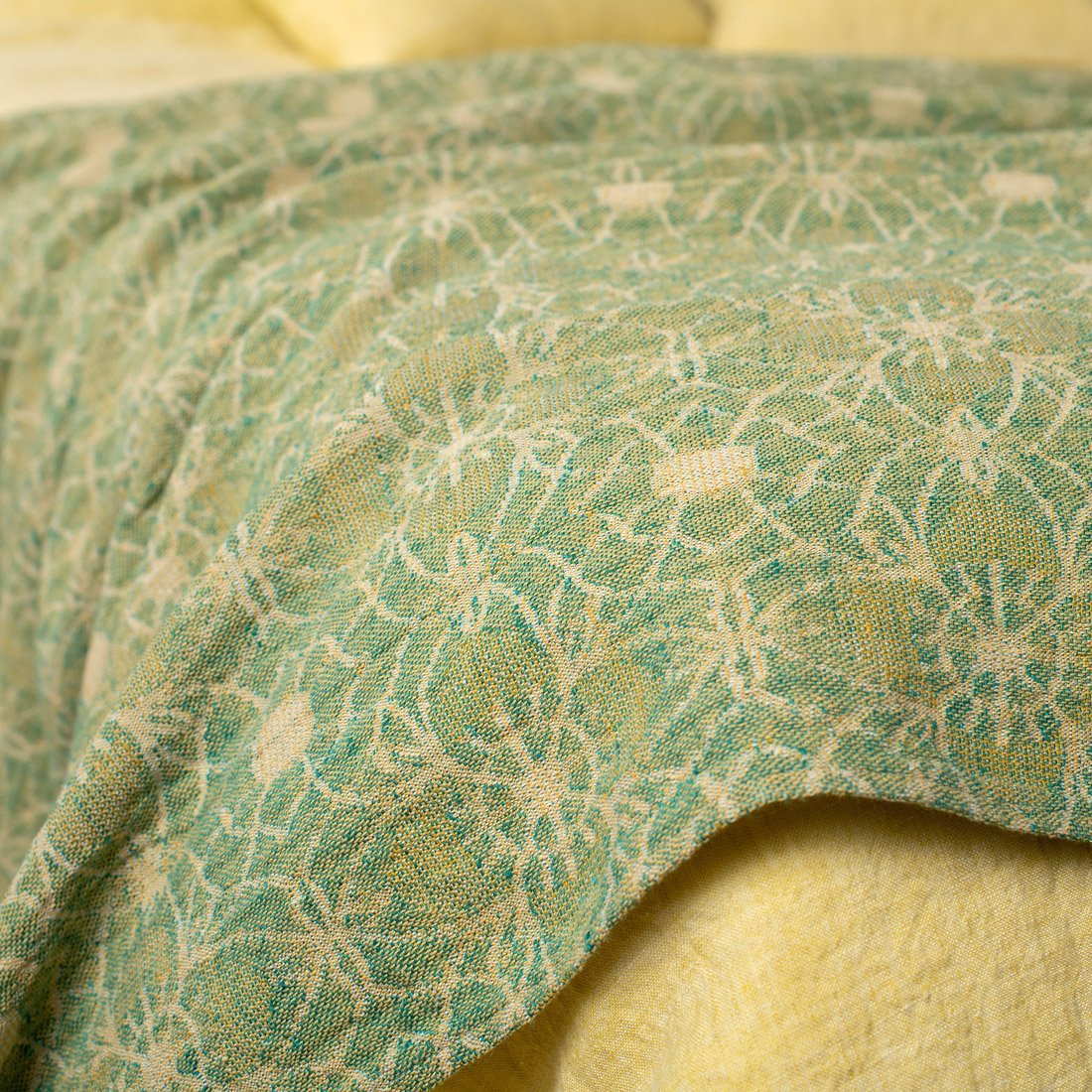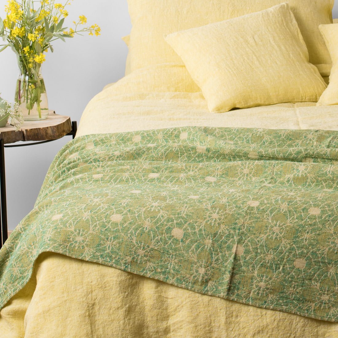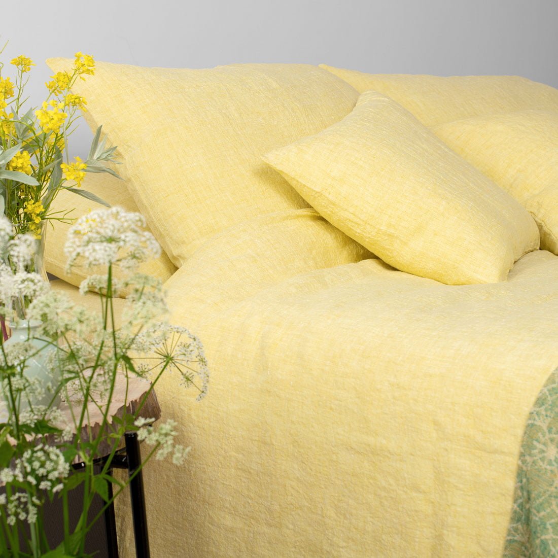 - Geltonas lininis antklodės užvalkalas užsegamas sagomis apačioje.