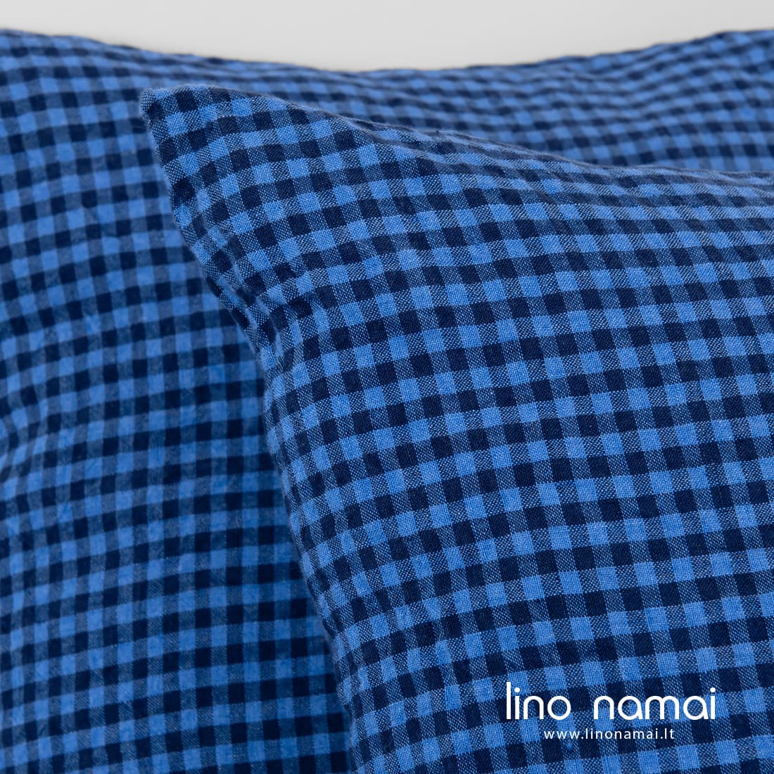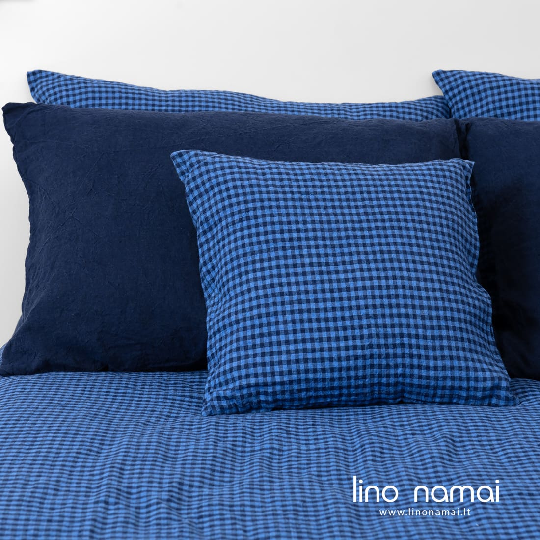 - Mėlynai languotas lininis pagalvės užvalkalas su užkaitu šone.