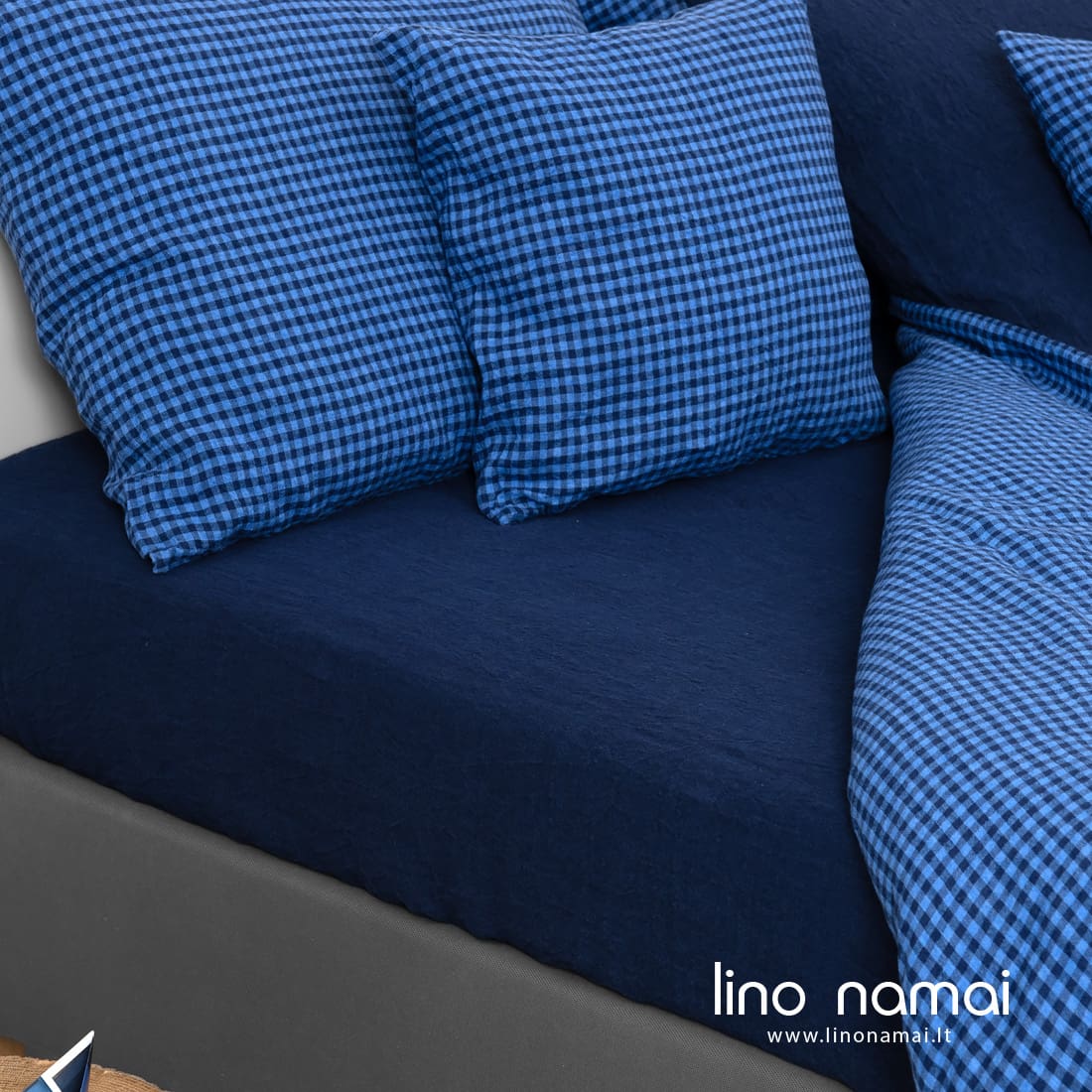 - Tamsiai mėlyna lininė paklodė gali būti paprastai apsiūta arba su guma.