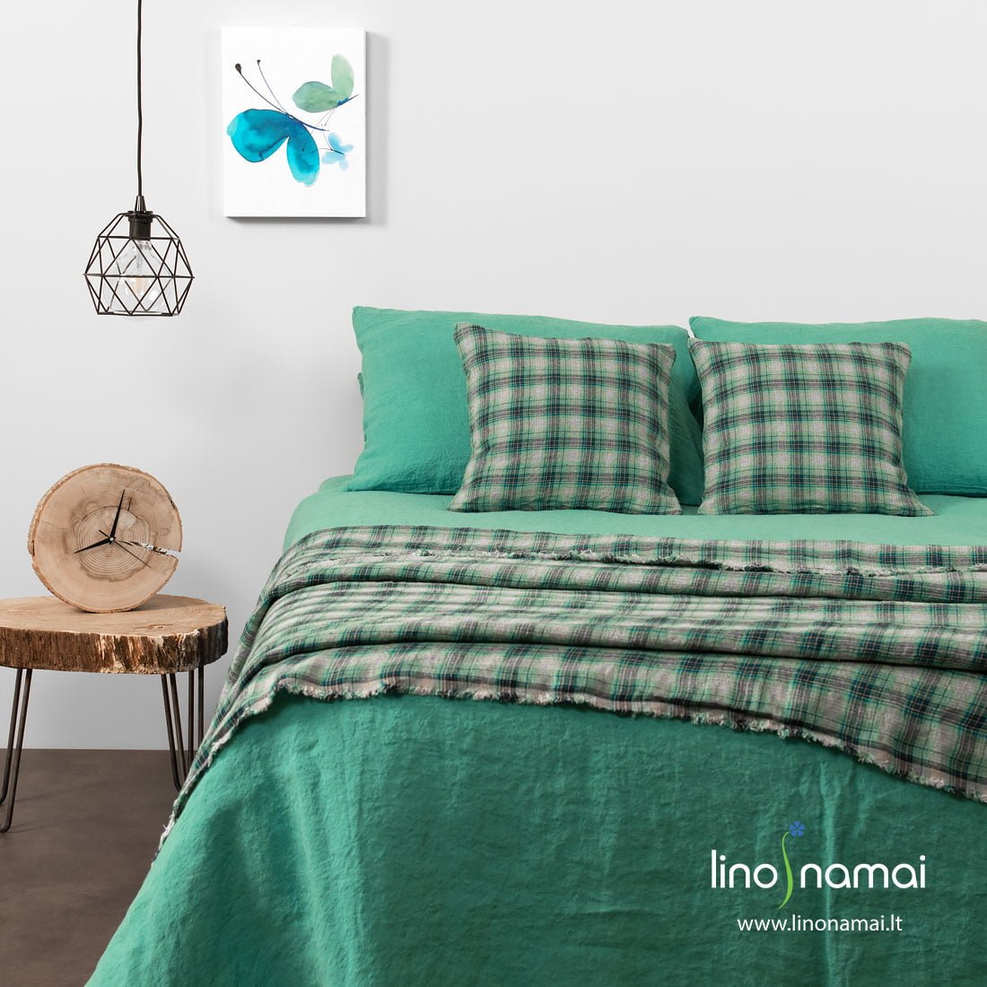 - Ryškiai žalias lininis antklodės užvalkalas užsegamas sagomis apačioje.