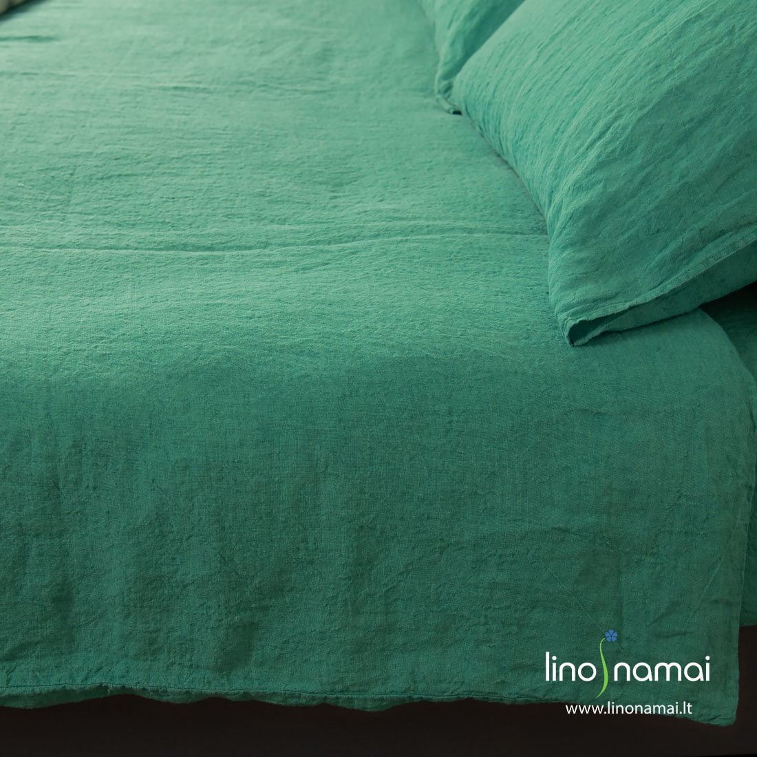- Ryškiai žalia lininė paklodė gali būti paprastai apsiūta arba su guma.