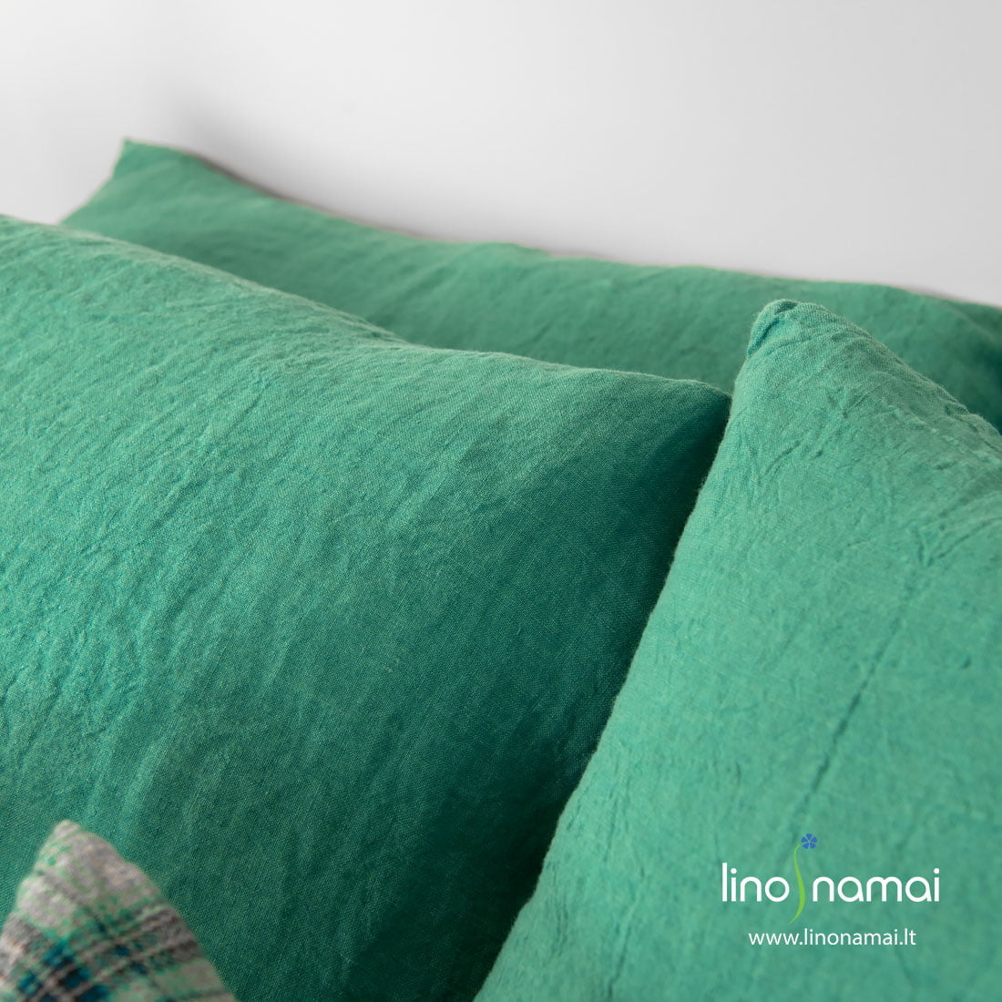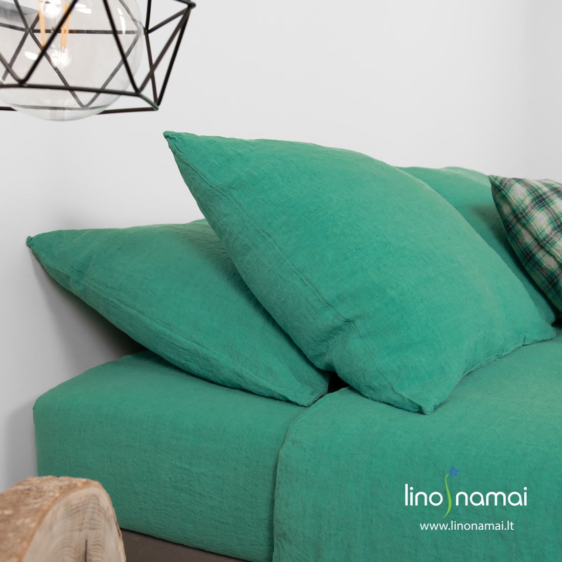 - Ryškiai žalias lininis pagalvės užvalkalas su užkaitu šone.