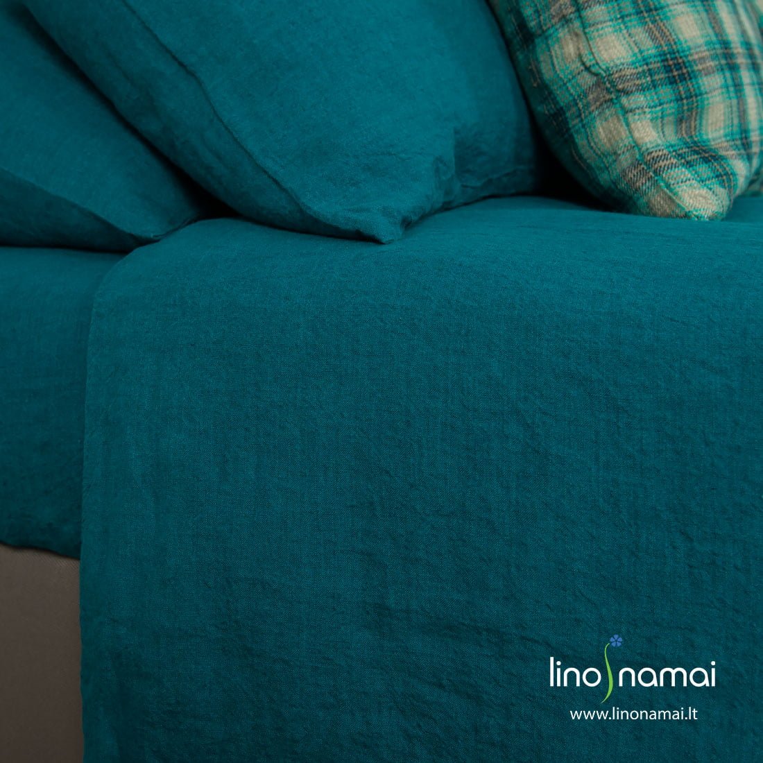 - Tamsios turkio spalvos lininė paklodė gali būti paprastai apsiūta arba su guma.