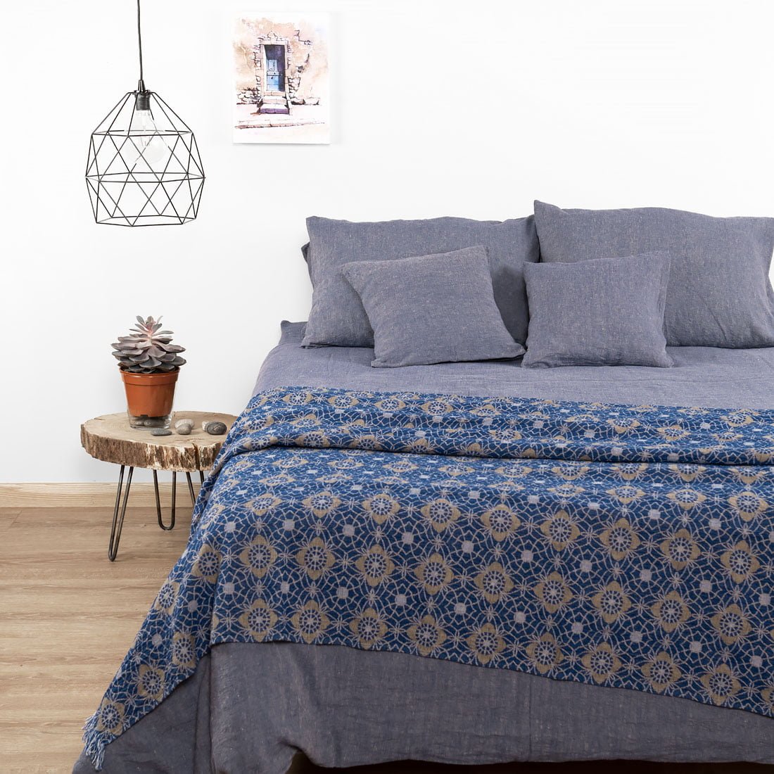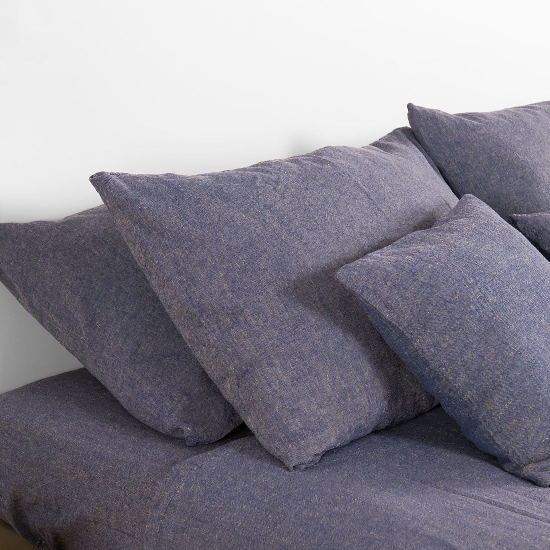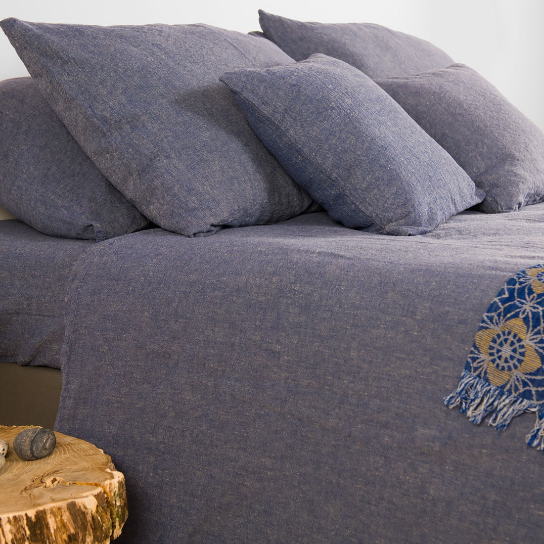Šios lino - medvilnės patalynės gaminiai (antklodės, pagalvės užvalkalai, paklodės) pasiūti iš melanžinio, suausto iš tamsiai mėlynų ir smėlio spalvos, rusvai pilkų verpalų, audinio. Būsite nustebinti, koks minkštas ir malonus odai gali būti lininis audinys - jį išskalbėme specialia technologija. Mėgaukitės ramiu miegu natūralaus pluošto patalynėje. Pagyvinkite savo miegamajį melsvu, raminančiu margumu.