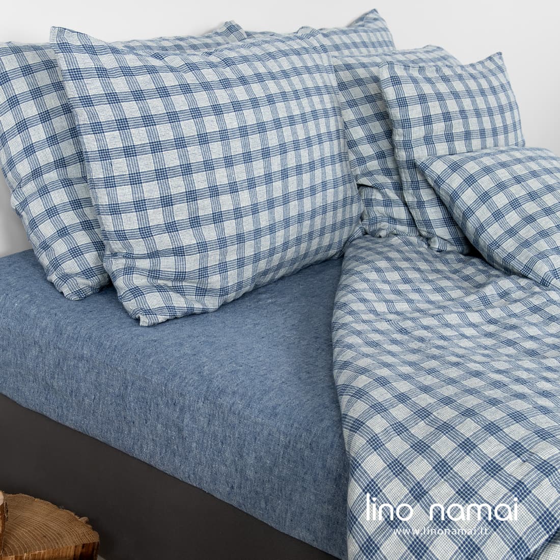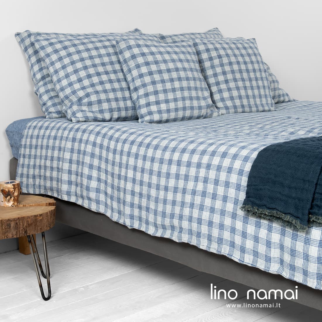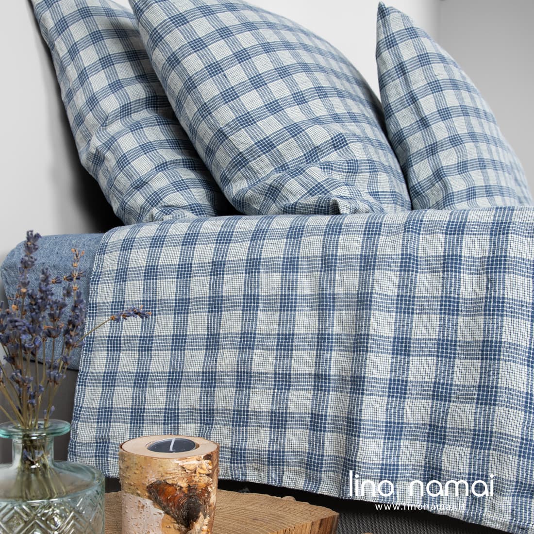 - Mėlynai languotas antklodės užvalkalas užsegamas sagomis apačioje