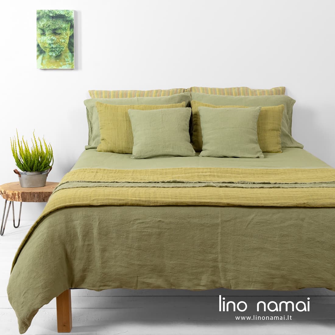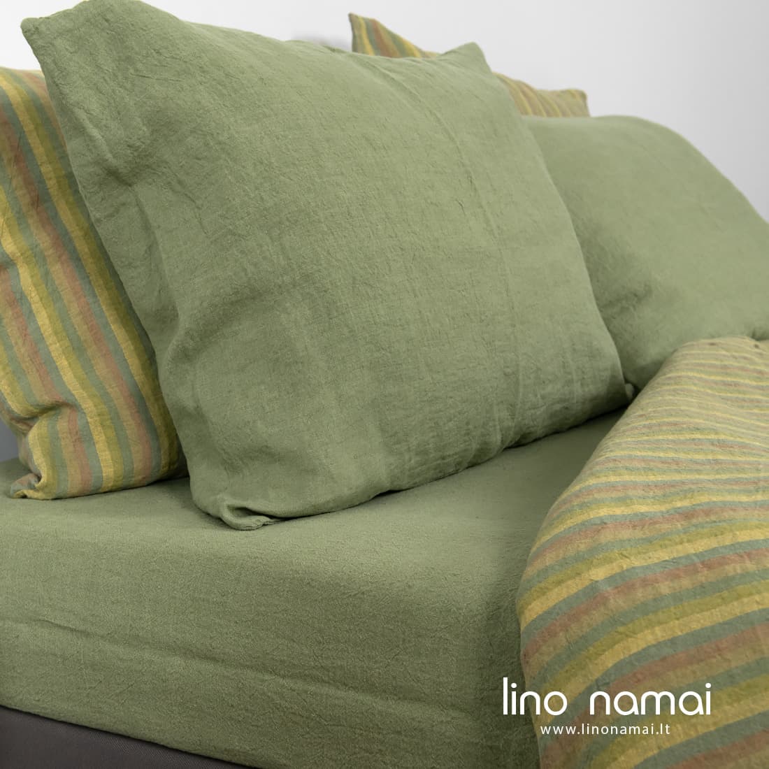 OLIV lininė patalynė. Jos 100% lino audinį išaudėme iš šviesiai žalių verpalų ir išskalbėme specialia technologija, kad suteiktumėme minkštumo, švelnumo ir purią struktūrą. Ramybę nešanti šviesiai žalia spalva ir jaukus linas dovanos saldžiausius sapnus! Jei norėtumėte įsigyti derančią lovatiesę, siūlome rinktis ALOE kolekcijos gaminius. Lovatiesėms, dekoratyvinių pagalvėlių užvalkalams naudojome tos pačios šviesiai žalios spalvos verpalus, juos derinome su gelsvai žalsvais verpalais.