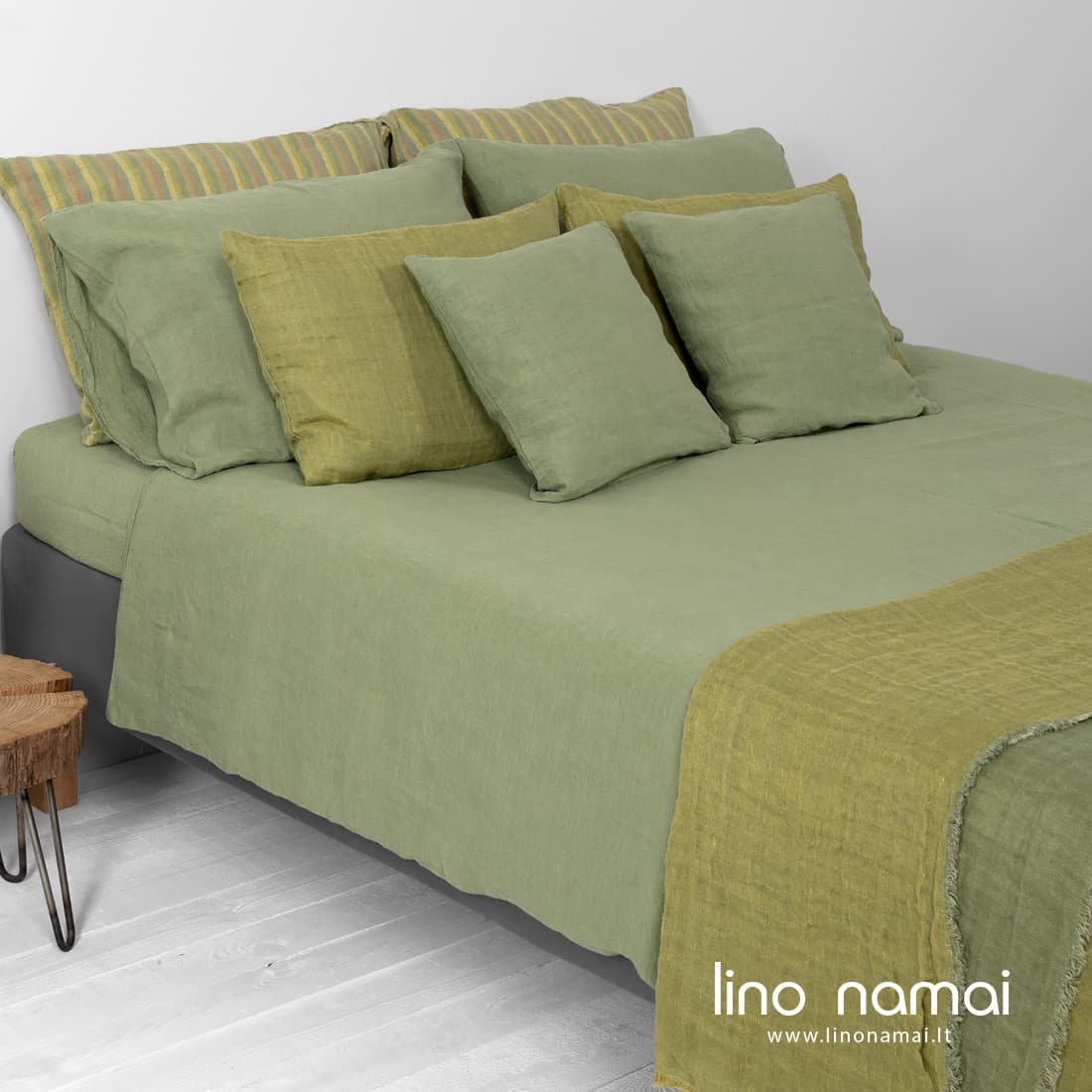 - Šviesiai žalias lininis antklodės užvalkalas užsegamas sagomis apačioje.