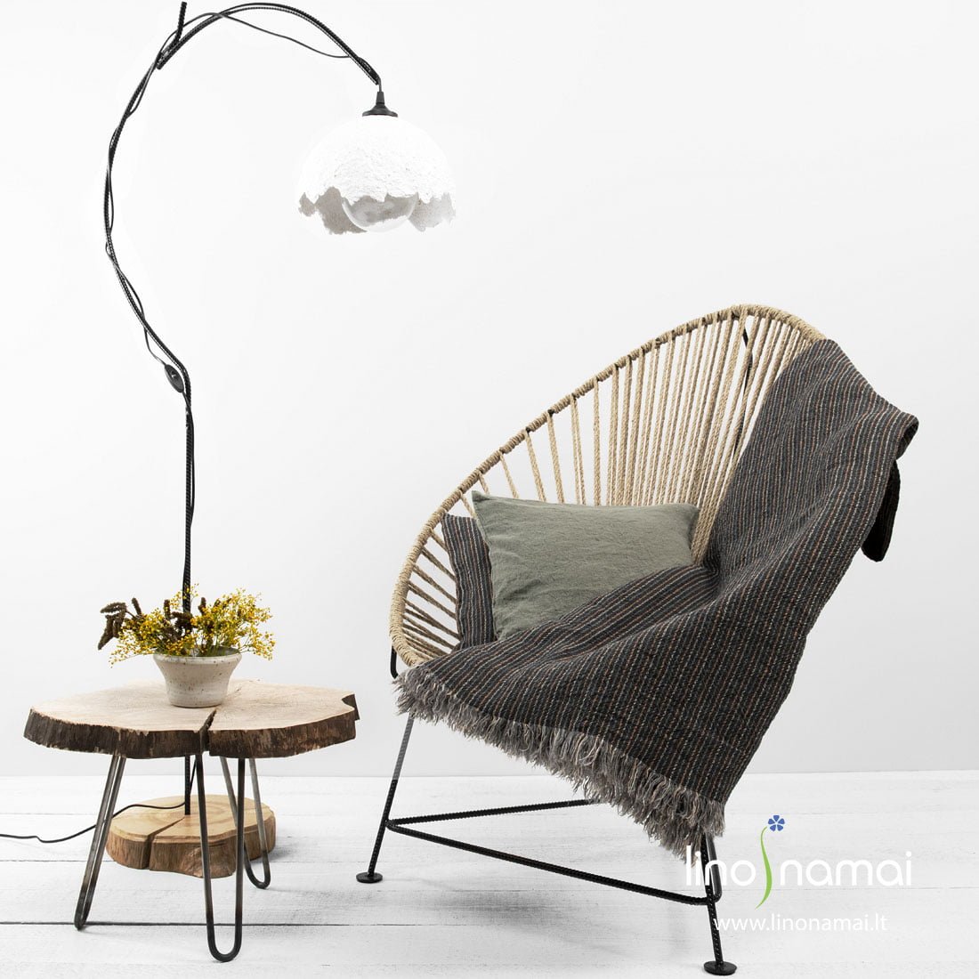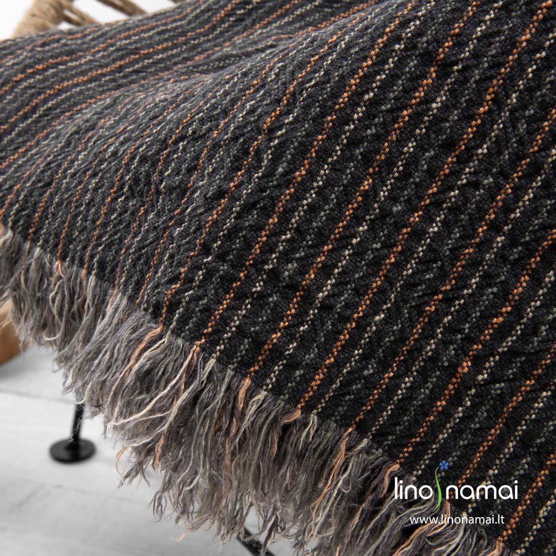 Lininis pledas dryžuotas. Kaip pagrindą gaminio audiniui naudojome tamsiai pilkus lininius verpalus, pagražinome įausdami siaurus smėlio spalvos (pilkšvai rusvus), šviesiai rudus ir žalsvai pilkus dryžius. Šis pledas ypač minkštas ir švelnus, nes jo audinys skalbtas specialia technologija. Gaminio trumpąsias kraštines puošia 5cm ilgio pešioti kutai. Elegantiškas santūrių spalvų pledas iš 100% lino natūralumo gerbėjams.