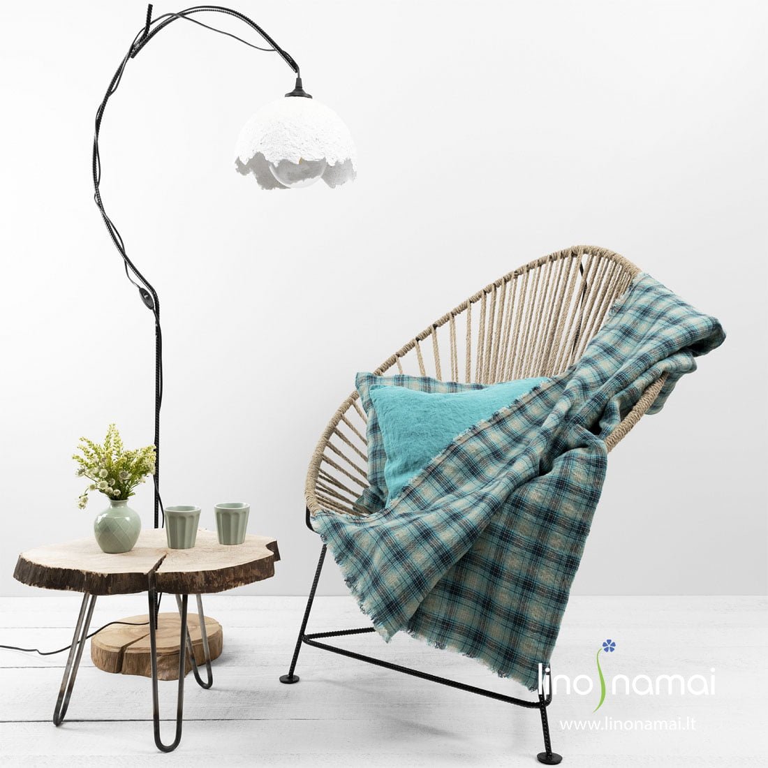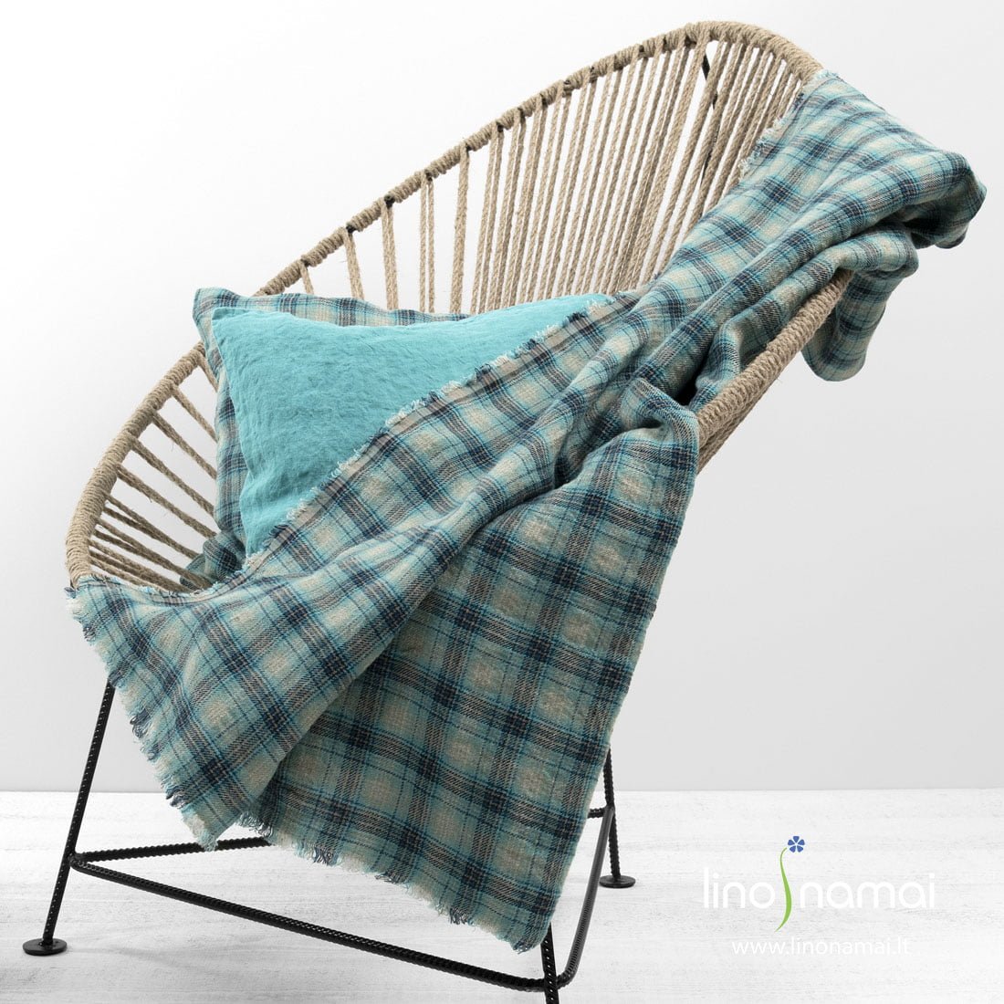 Lininis pledas žaliais langeliais, kuriuos išaudėme iš keleto atspalvių žalios, juodos bei natūralios spalvos (rusvai pilkų, nedažytų) verpalų įstrižų dryžiukų raštu. Specialus skalbimas suminkštino audinį, padarė jį švelnesnį, puresnį. Pledo visos kraštinės su 1,5cm ilgio pešiotais kutais. Ryškiaspalviai langeliai ir natūralus minkštas 100% linas papuoš Jūsų sofą, jaukiai apklos užsnūdus.