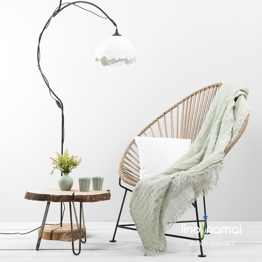 Pasiilgusiems pastelinių spalvų ramybės ir gaivos, puiki galimybė įsigyti nuostabų pledą. Pasakiškai gaivi mėtų žalia spalva pažadina įkvėpimą, o pieno balta suteikia pastelinio švelnumo. Šis nuostabus, storas ir purus, dvipusis pledas leidžia naudoti tiek vieną, tiek kitą pusę derinant prie kambario interjero. Lininis pledas puoštas 5cm kutais trumposiose kraštinėse. Gaminys skalbtas specialia audinių skalbimo technologija, kad taptų išskirtinai minkštas ir švelnus, o išskalbus ateityje - nebesitrauktų. Jei mėgstate žalias dekoro detales interjere, šis lininis pledas puikiai įsilies į Jūsų namų aplinką.