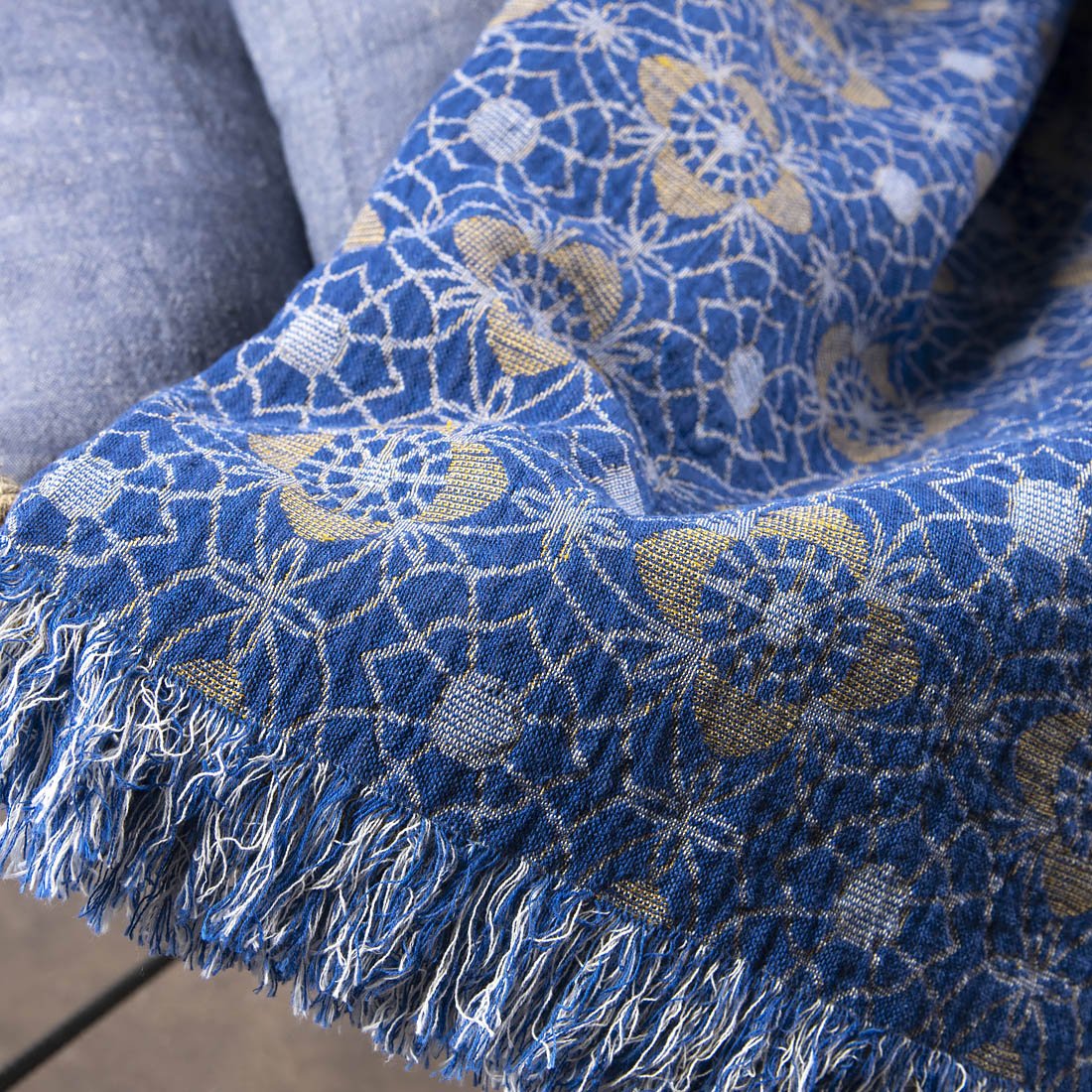 Laikas apgaubti save nauju, šiltu ir prabangiu pledu. Šis pledas austas žakardiniu raštu: karališkai mėlyname fone baltos bangos supa garstyčių gelsvus gėlių žiedų ornamentus. Šis puošnus lino / medvilnės pledas trumposiose kraštinėse užbaigiamas 5cm kutais. Gaminys skalbtas specialia audinių skalbimo technologija, kad taptų išskirtinai minkštas ir švelnus, o išskalbus ateityje - nebesitrauktų. Leiskite sau pasimėgauti poilsio akimirka, apsigaubus šiuo nuostabiu pledu ar atnaujinti interjerą užklojus juo lovą.