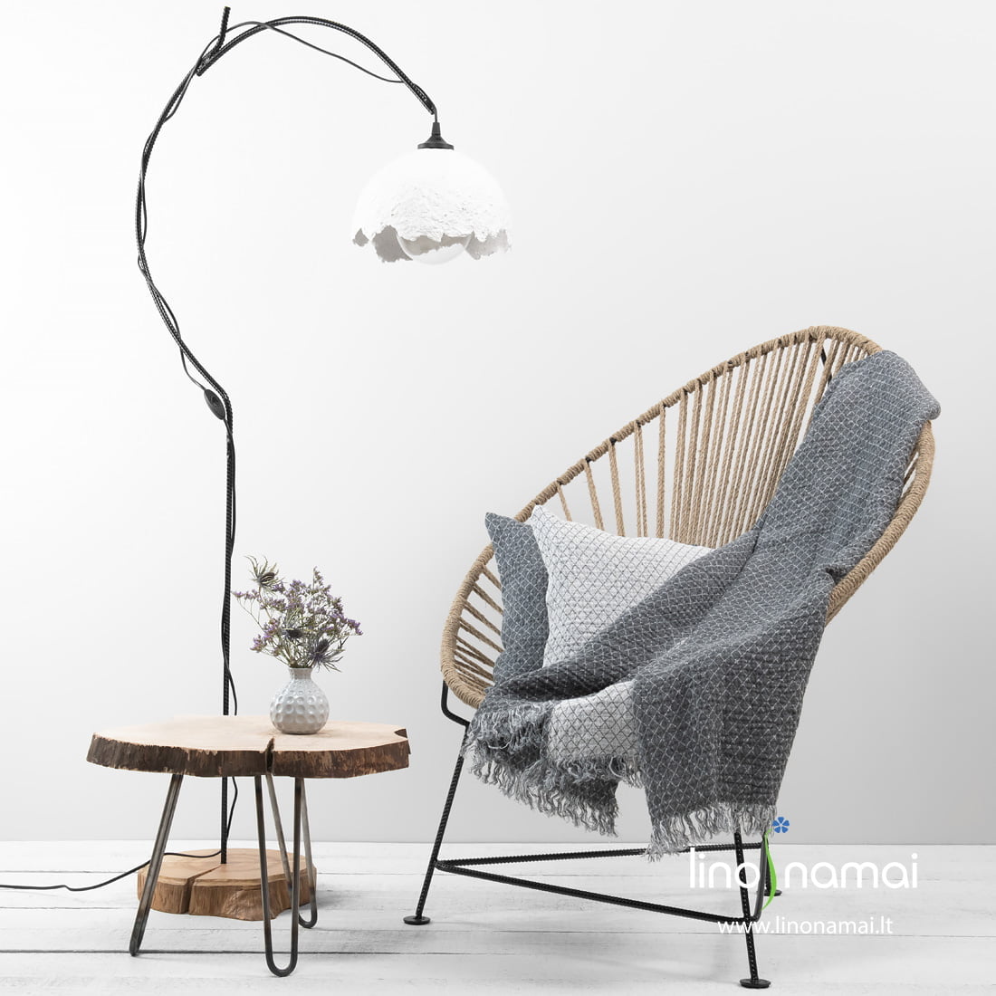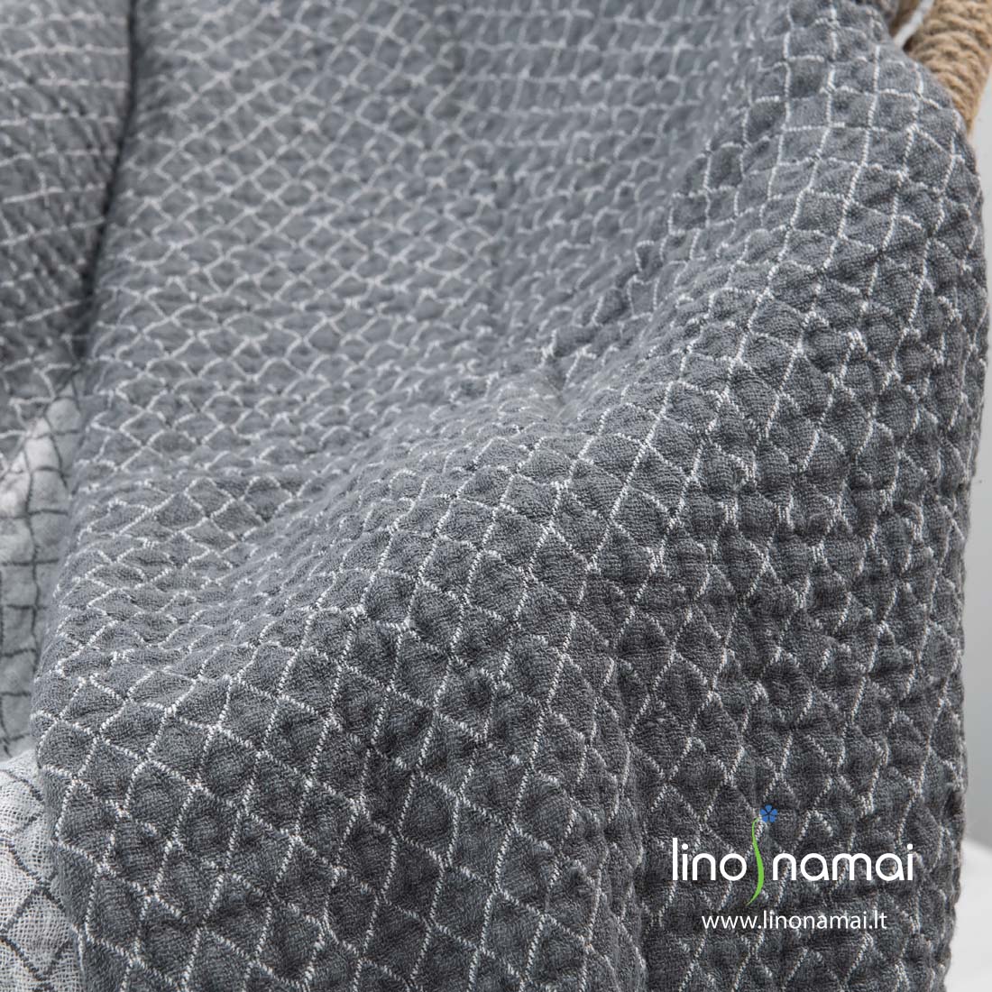 Lininis žakardinis dvipusis pledas: tamsiai pilkos spalvos fone austi žaismingi balti rombeliai, kitoje pledo pusėje – analogiškas pilkų rombelių piešinys pieno baltos spalvos fone. Puoštas 5cm kutais trumposiose kraštinėse. Gaminys skalbtas specialia audinių skalbimo technologija, kad taptų išskirtinai minkštas ir švelnus, o išskalbus ateityje nebesitrauktų.