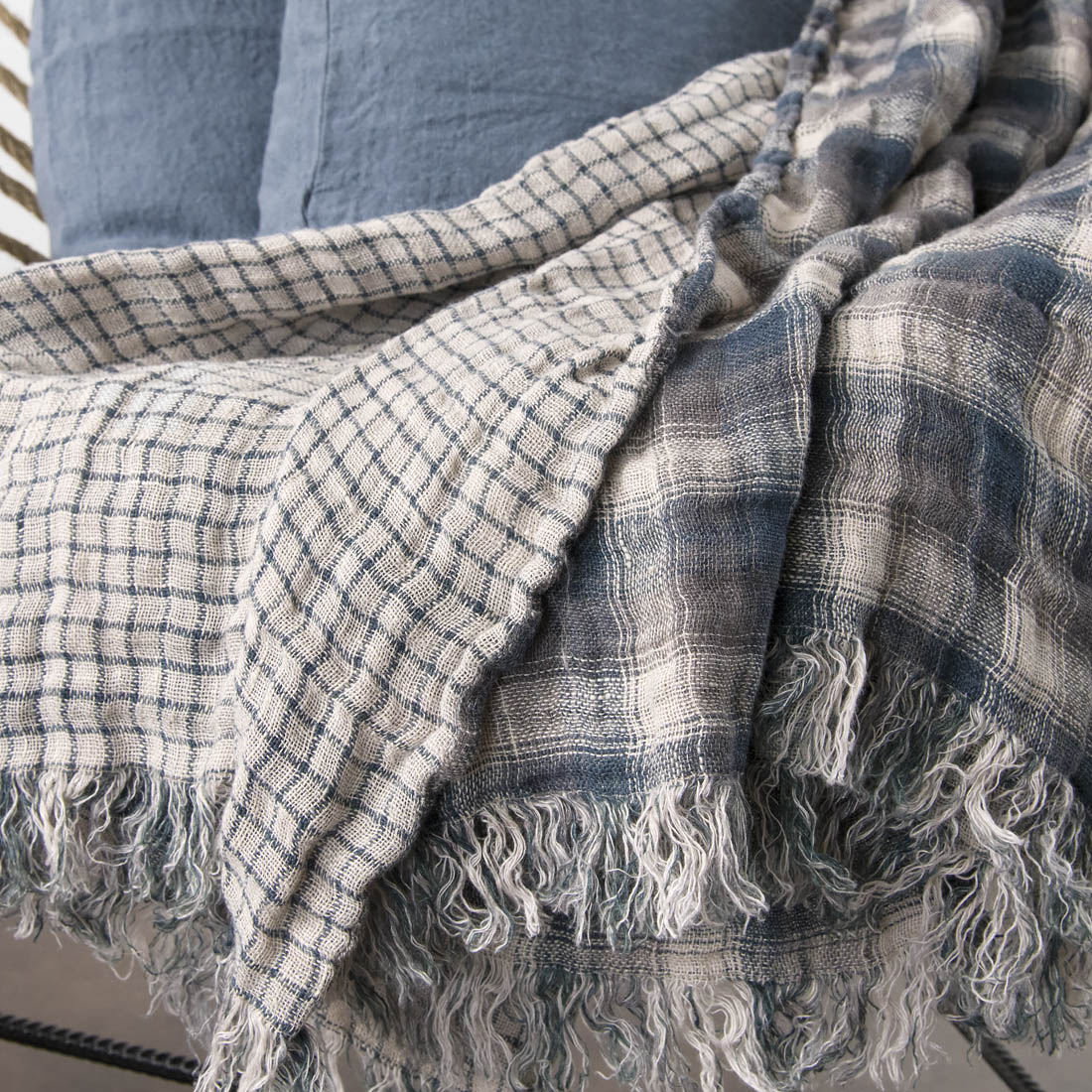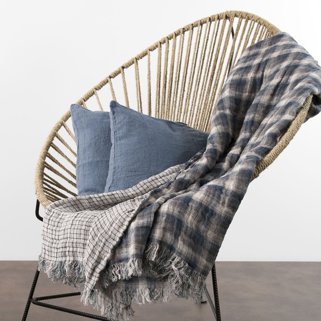 Dvipusis pilkos spalvos, mėlynais langeliais lininis pledas, puoštas 5 cm kutais. Natūralus lininis pledas pagamintas iš lengvo ir minkšto skalbto audinio, todėl po skalbimo pledas nebesitrauks. Lininis pledas taps nepakeičiamas vėstant orams ar ilgėjant vakarams.