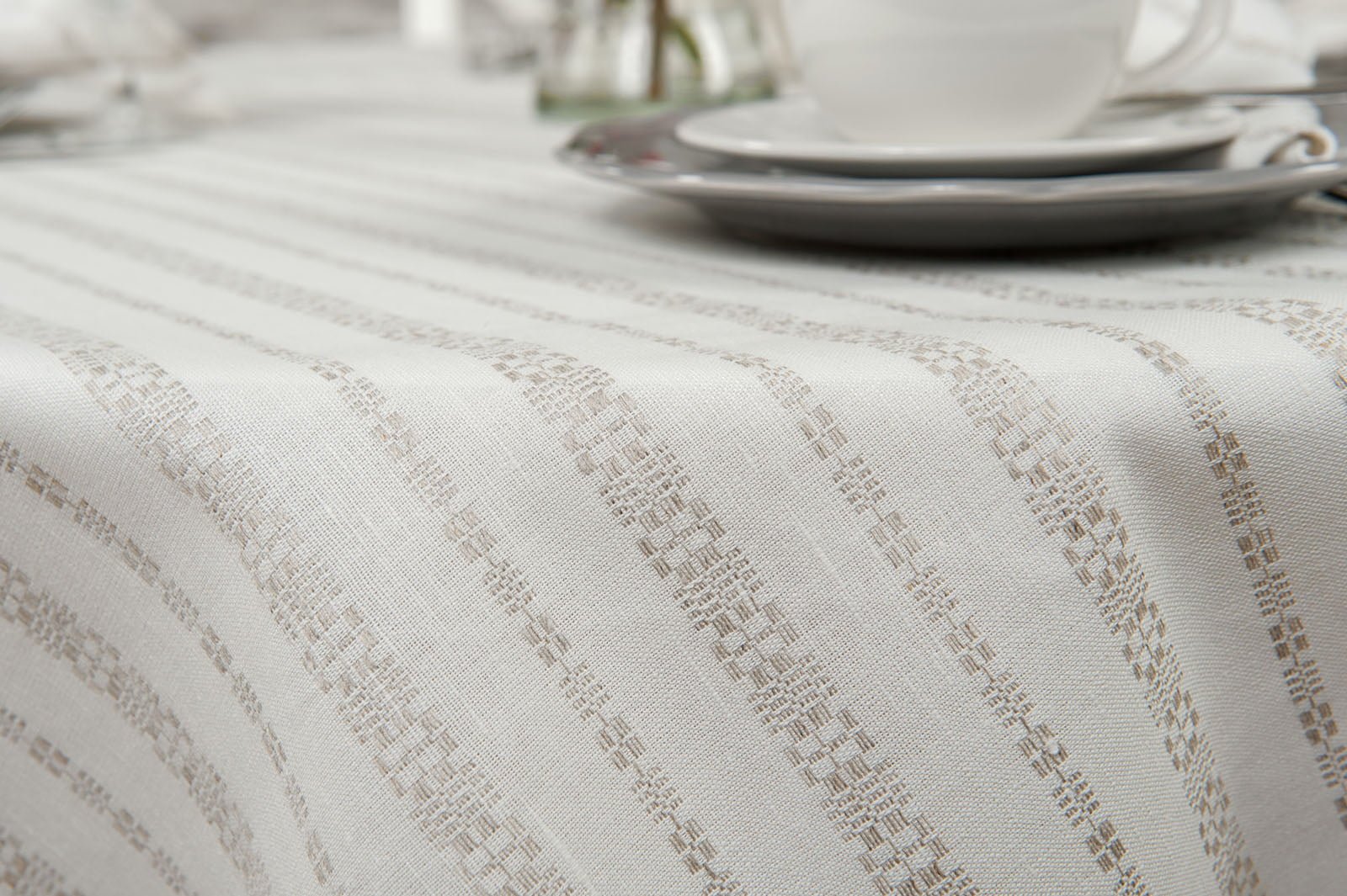 Apvali (Galite rinktis ir ovalios formos.) staltiesė su pilkais dryžiais, austais subtiliu tautiniu raštu, ant pieno baltumo (gelsvai balto) pagrindo. Staltiesę įrėmina baltas kantelis. Internetinėje Lino Namų parduotuvėje rasite ir raštuotas derančias servetėles. Išskirtinėmis progomis suteikite savo stalo dekorui dailių tautinių akcentų!